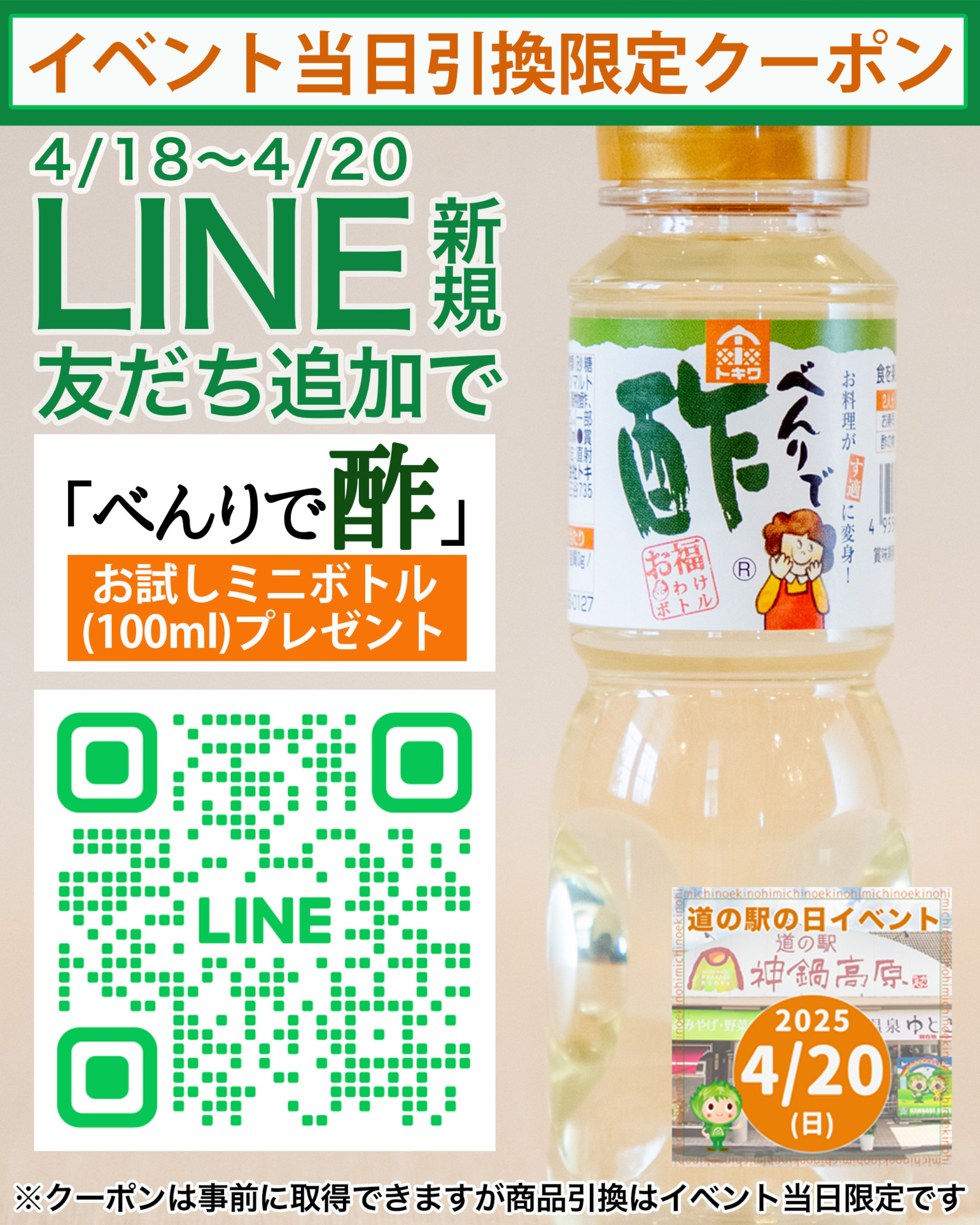 LINE新規友だち追加で「べんりで酢」お試しミニボトルプレゼント&ポイント2倍DAY<道の駅の日イベント当日限定>
