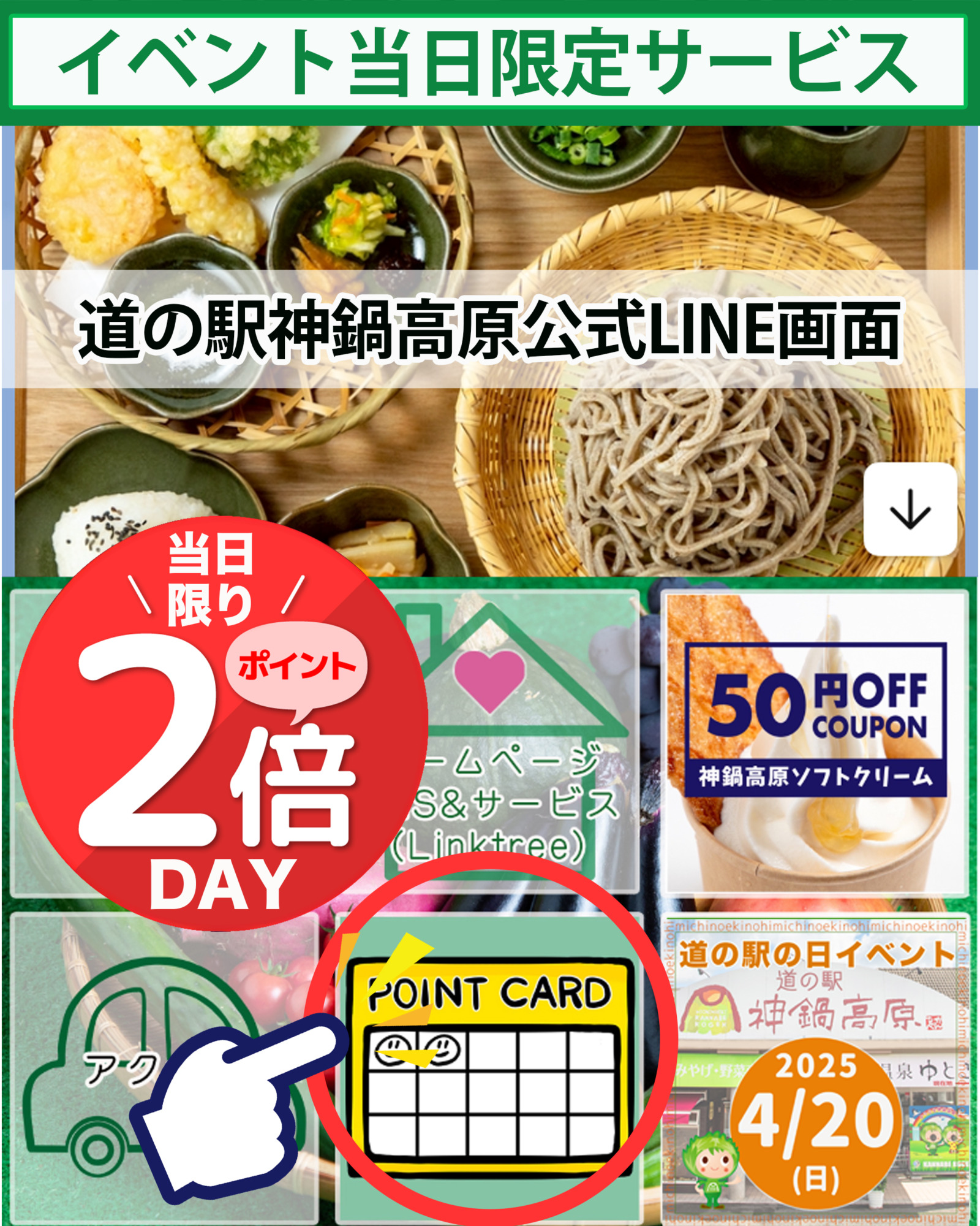 ・全てのLINE友だちの方を対象に、当日の売店(直売所含)お買い物金額に応じてポイントを通常の2倍付与させていただきます。 |