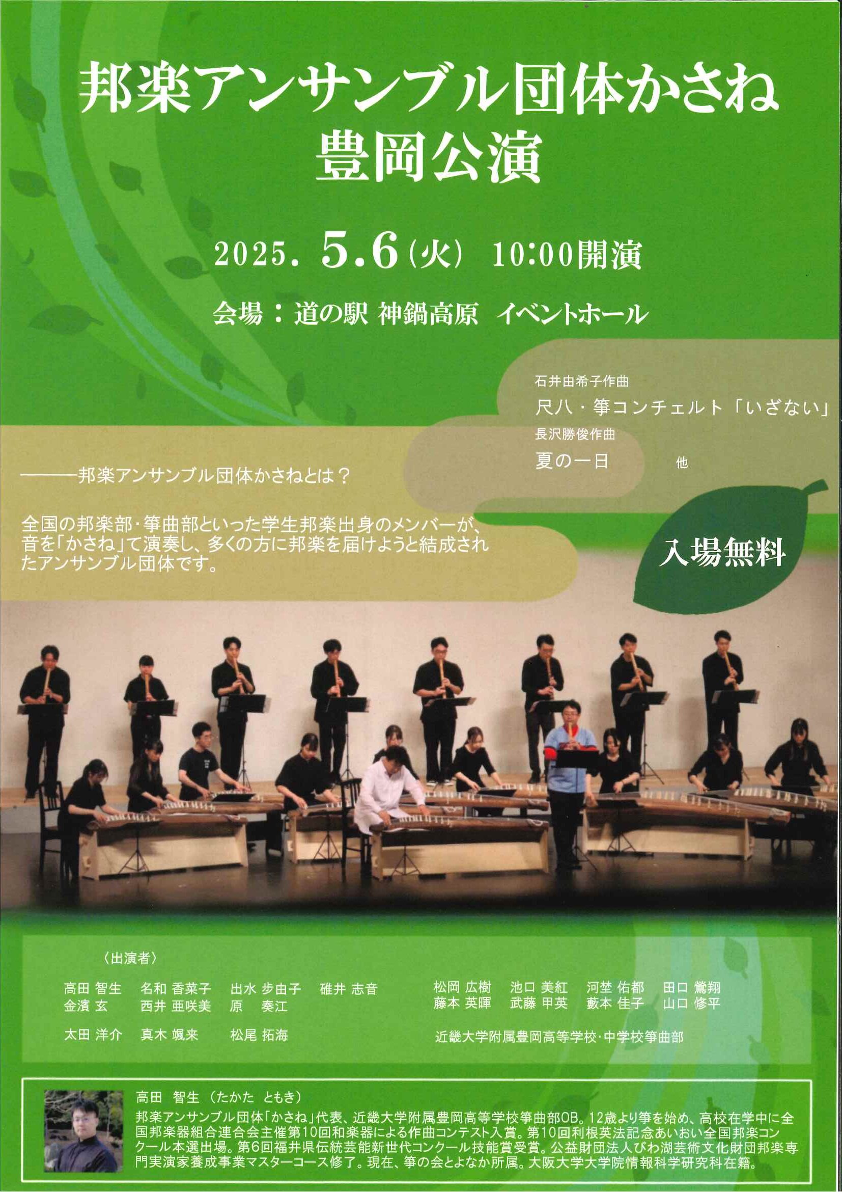 イベントEvent 2025.05.03 邦楽アンサンブル団体かさね豊岡公演 邦楽アンサンブル団体かさねの豊岡公演が、道の駅神鍋高原で開催されます。 近畿大学付属豊岡高等学校・中学校箏曲部の皆さんも参加されます。 箏と尺八の音色を聴きにお越しください。 日時:2025年5月6日(火) 10時開演 会場:道の駅「神鍋高原」イベントホール 入場無料 邦楽アンサンブル団体かさねとは? 全国の邦楽部・箏曲部といった学生邦楽出身のメンバーが音を「かさね」て演奏し、多くの方に邦楽を届けようと結成されたアンサンブル団体です。 BACK RELATED SITES 関連サイト SNS 神鍋高原の季節の情報をお届けします お食事処かんなべ<12月の土日祝ビュ 2025年末から2026年始にかけての営業時 予約必須!2日間限定の鍋ディナー🔥