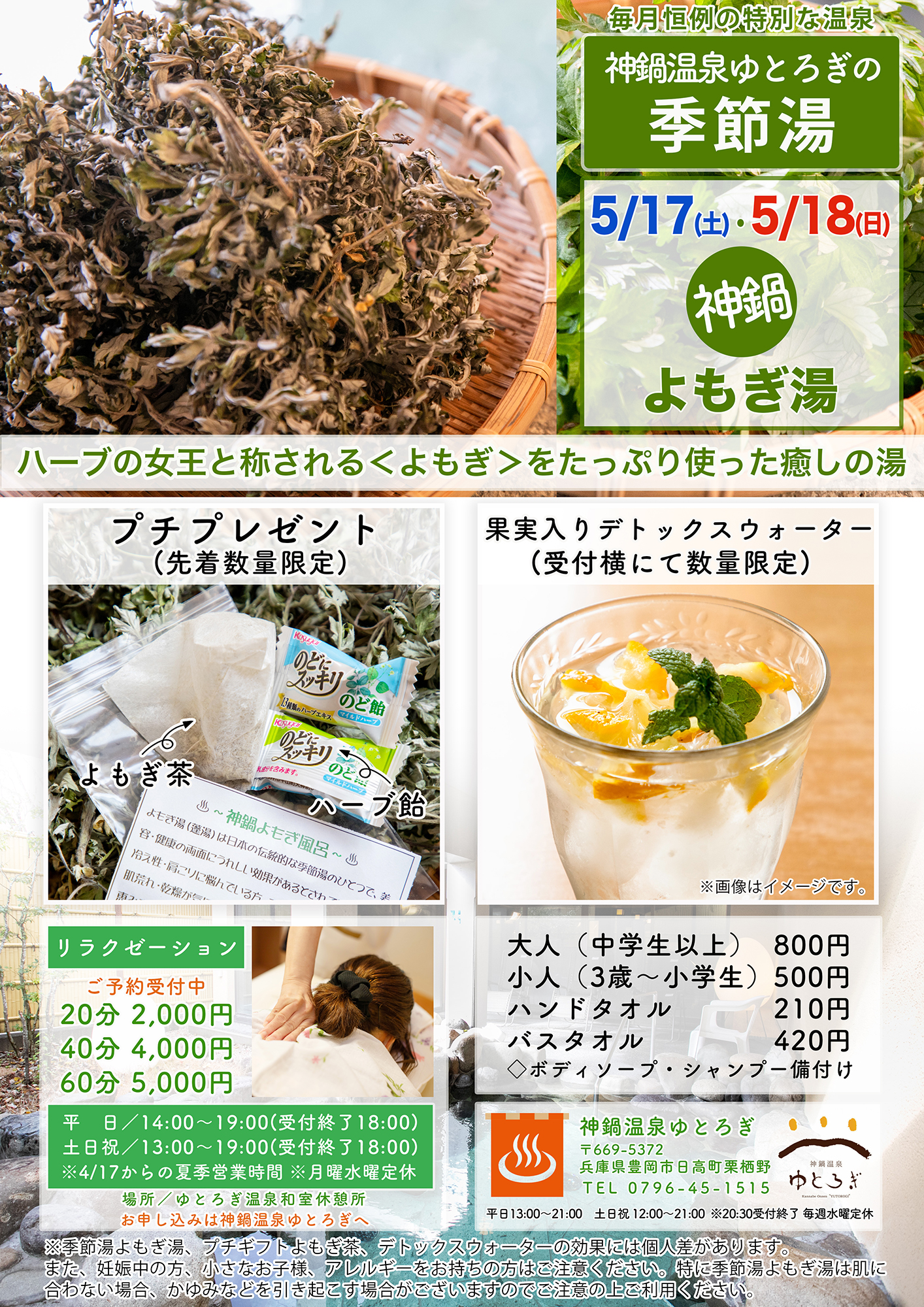 ※季節湯よもぎ湯、プチギフトよもぎ茶、デトックスウォーターの効果には個人差があります。また、妊娠中の方、小さなお子様、アレルギーをお持ちの方はご注意ください。特に季節湯よもぎ湯は肌に合わない場合、かゆみなどを引き起こす場合がございますのでご注意の上ご利用ください。