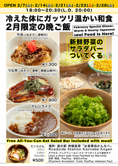 “Oshokujidokoro Kannabe” (inside the Roadside Station) is open for dinner in February!