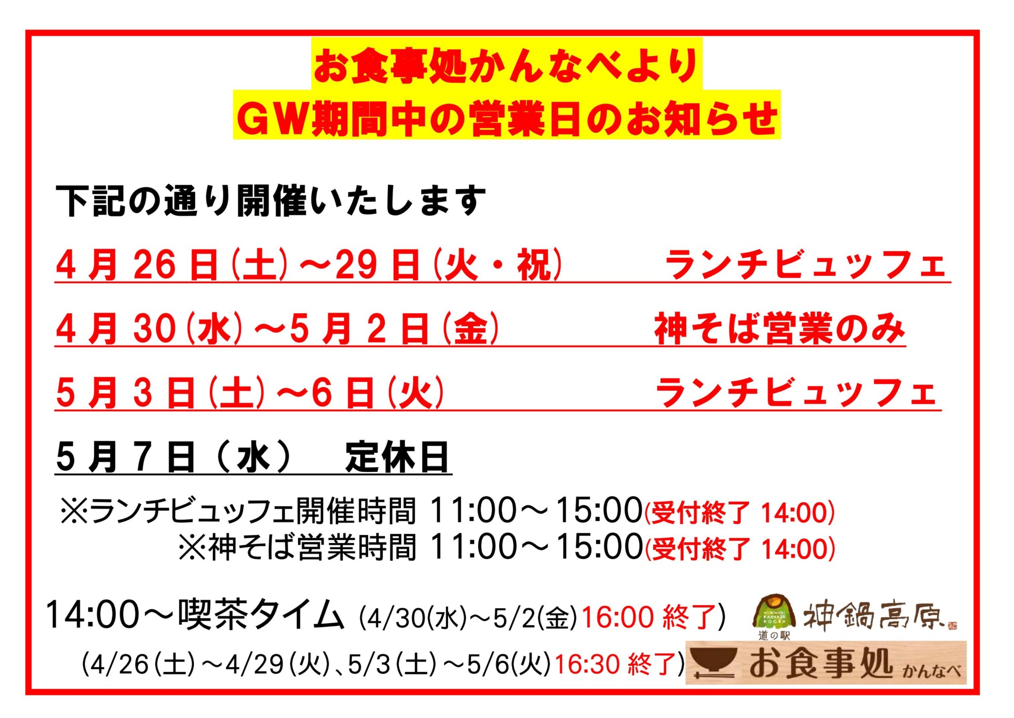 グルメ情報Gourmet 2025.04.22 お食事処かんなべGW期間中の営業についてご案内 Newsでご確認ください。 BACK RELATED SITES 関連サイト SNS 神鍋高原の季節の情報をお届けします 【2/15限定】冬の神鍋、一番甘い1日。 \ 2月は毎日オープン!昼も夜も「道 KANNABE ROOTS #神鍋高原 #道の駅神鍋高原 月曜日、お疲れさまでした🍵 疲れた
