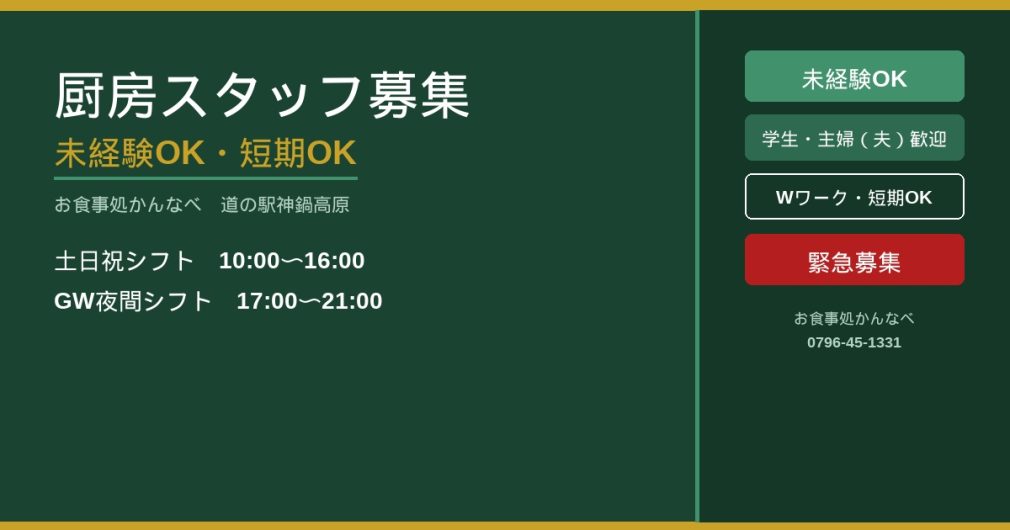 道の駅神鍋高原のレストラン「お食事処かんなべ」では、土日祝に働ける厨房スタッフ(アルバイト・パート)を募集しています。