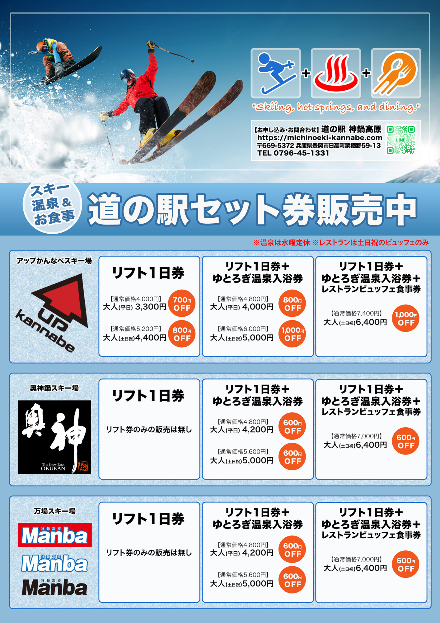 道の駅神鍋高原が新たにスキーリフト券、温泉、そしてお食事の特別セットを販売開始しました。神鍋の自然を感じながら最高のスキー体験を楽しみ、温泉で心身を癒し、地元の美味を味わい尽くす贅沢なひとときをお過ごしください。冬の思い出を作る絶好のチャンスです。ぜひご家族やお友達と神鍋高原へお越しください。