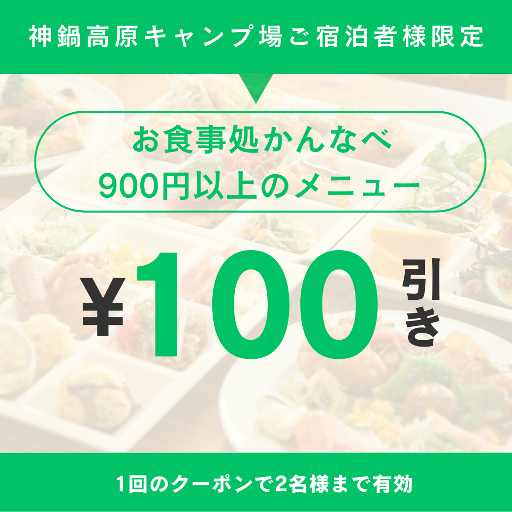神鍋高原キャンプ場&お食事処かんなべコラボレーション企画 ご宿泊者様限定900円以上のメニュー100円引割