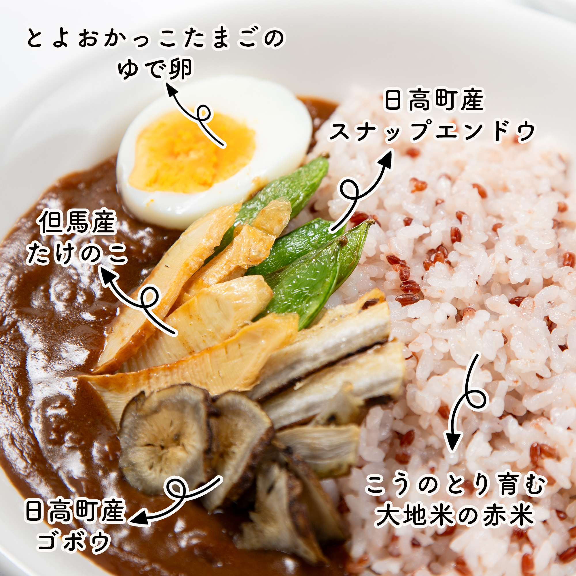 | 日高町産スナップエンドウ | 但馬産たけのこ | 日高町産ゴボウ | とよおかっこたまごのゆで卵 |