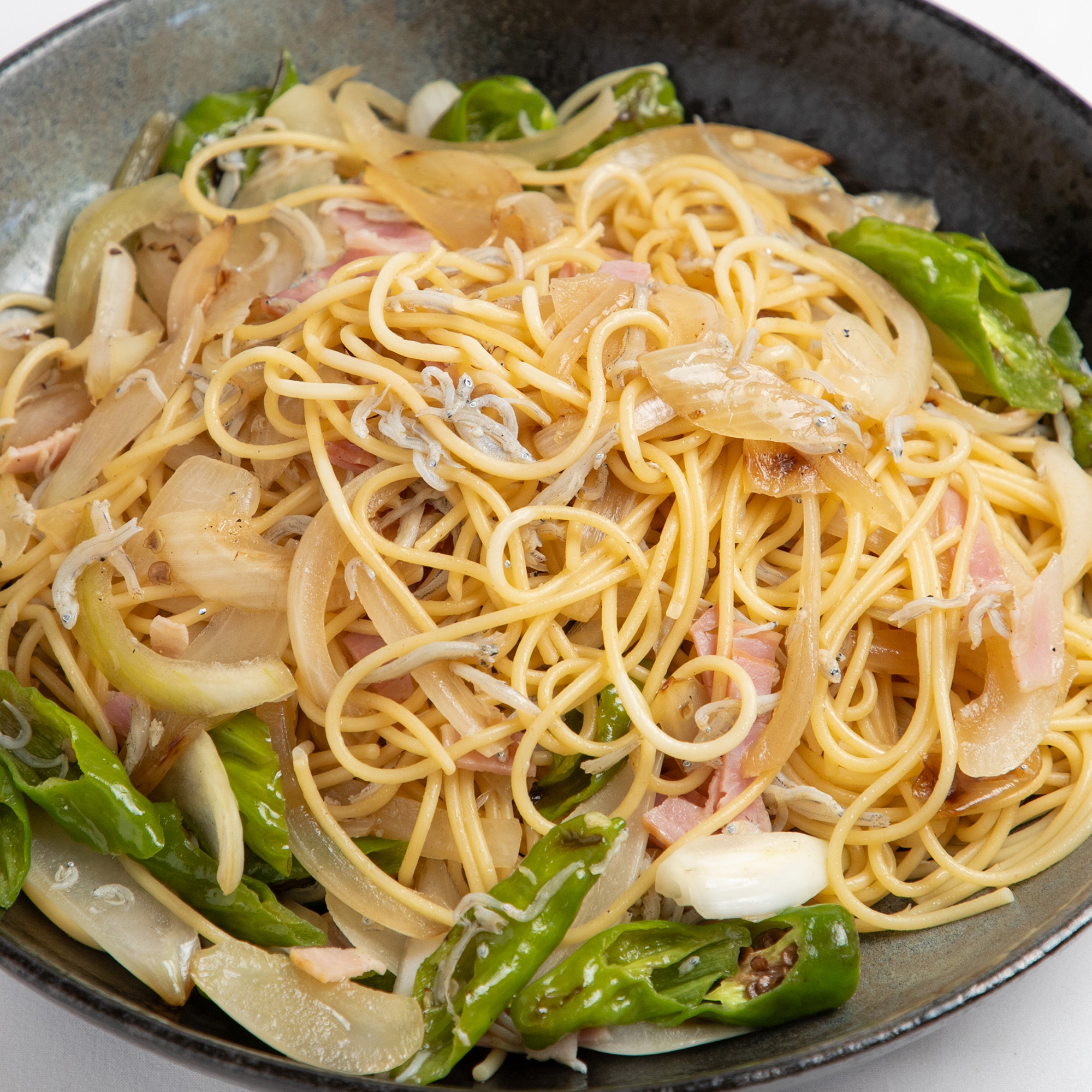 直売所に出荷されている旬の野菜とちりめんじゃこを使用。食材の旨味がたっぷりと詰まった醤油風味の和風パスタです。