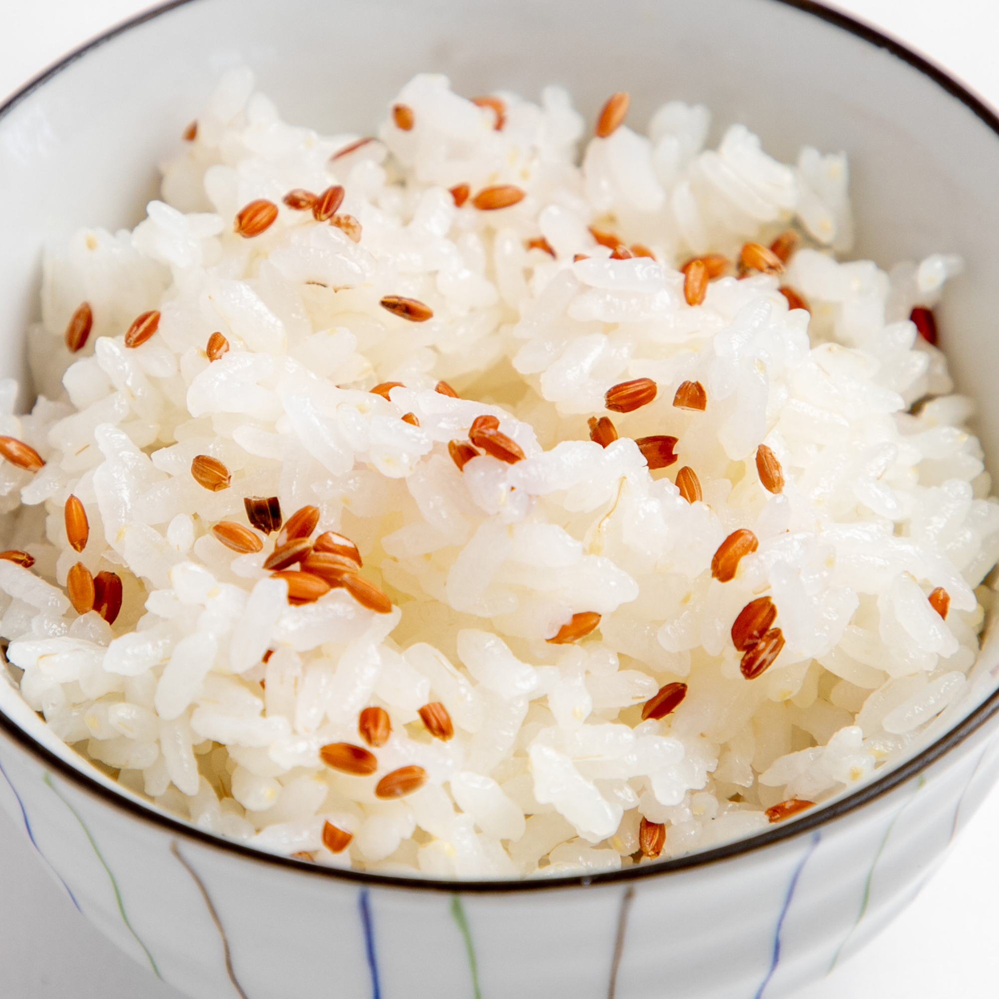豊岡市産の赤米とコウノトリ育む米を一緒に炊きました。赤米のプチプチとした食感をお楽しみください。