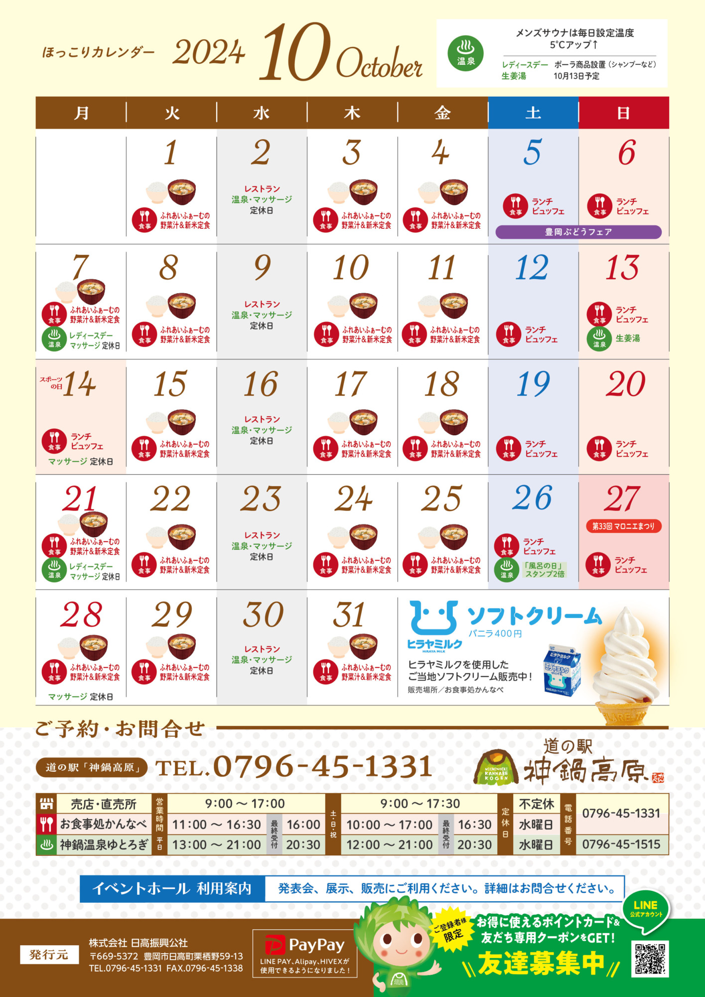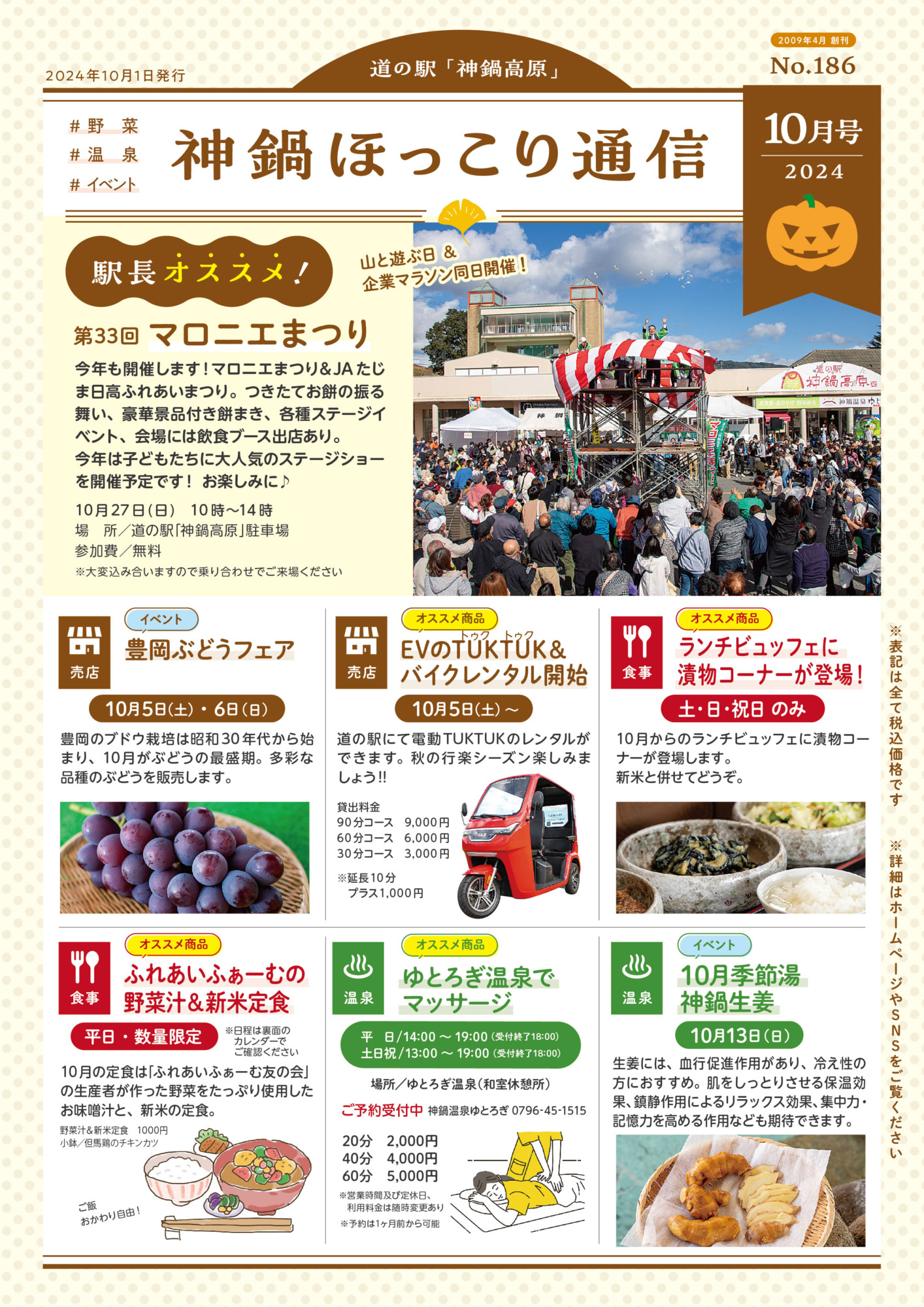 お知らせNews 2024.09.28 神鍋ほっこり通信/2024年10月号 毎月一回道の駅神鍋高原の嬉しい、楽しい、美味しい情報をお届けする「神鍋ほっこり通信」2024年10月号です。 BACK RELATED SITES 関連サイト SNS 神鍋高原の季節の情報をお届けします 工事中でも、お食事処かんなべは元気に営業中🍜 「どこから入るの?」そんな疑問は動画でまるっと解決! 神鍋高原に、春がやってきます 🌿 雪解けとともに芽吹く高原の恵みを 好きなものを好きなだけ、食べ放題 🏪 本日より、仮設店舗で営業スタート! 2/27(金)から、売店・直売所が仮設店舗にて営業を開始し 🍞 道の駅神鍋高原のパン屋さん 「Pain de “A”(パンドアー)」、知ってますか? 「神鍋の 🔨 道の駅神鍋高原、リニューアル工事のお知らせ! ご不便をおかけしますが、工事中も道の駅は元気に営 焚き火の夜に、自然の酒を。🔥 日本初のリジェネラティブ・オーガニック認証を取得したパタゴニア プロビ 「Let's nail this landing!」 「この着氷をバッチリ決めよう!」 神鍋高原か 近畿でここだけ。 噴火口が生んだローカルブランド「KANNABE ROOTS」 兵庫県豊岡市、神鍋 【2/14(土)当日限定!バレンタイン特別企画🍫🍦】 神鍋高原で愛される「ヒラヤミルク」ソフトが、 【2/15限定】冬の神鍋、一番甘い1日。 神鍋高原の冷たい北風と秋の日差しが作り上げた、天然の宝石