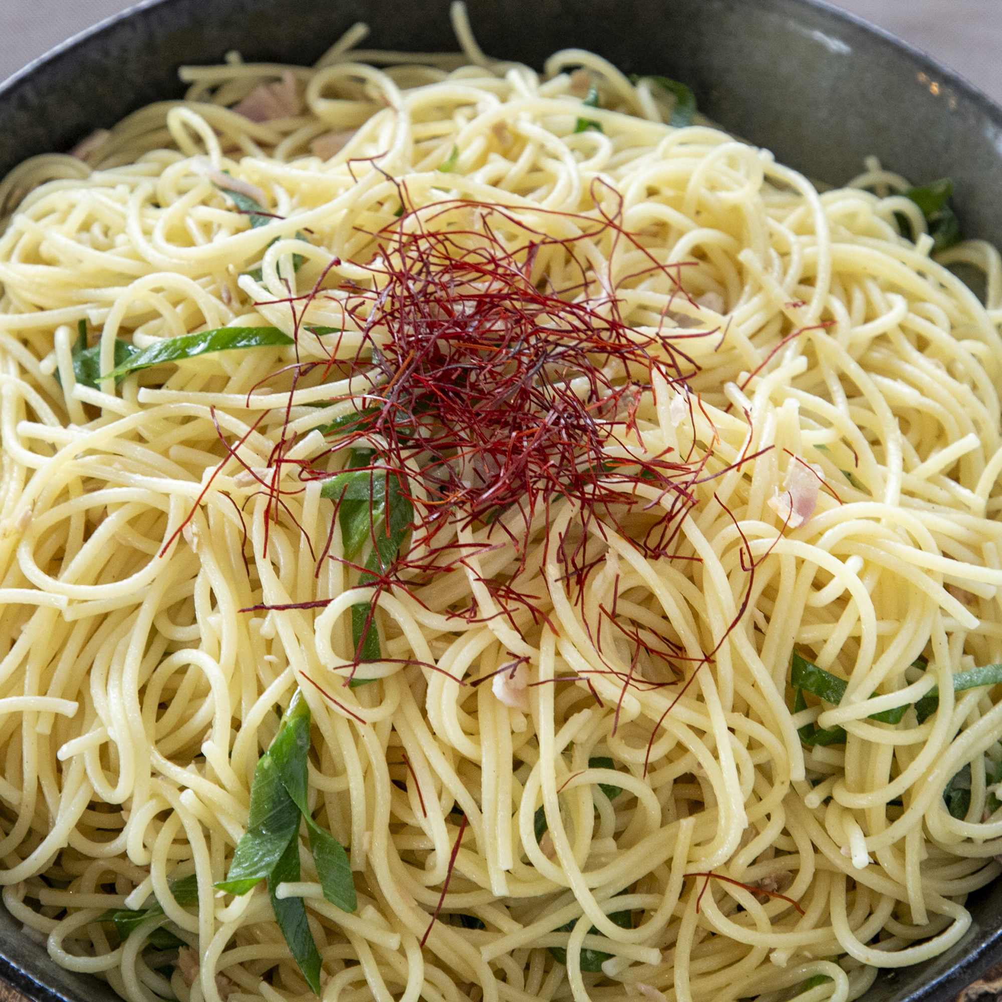 神鍋ねぎとシーチキンのペペロンチーノ。神鍋ねぎのあまみとシーチキンでコクを出し、にんにくと唐辛子が効いたパスタです。