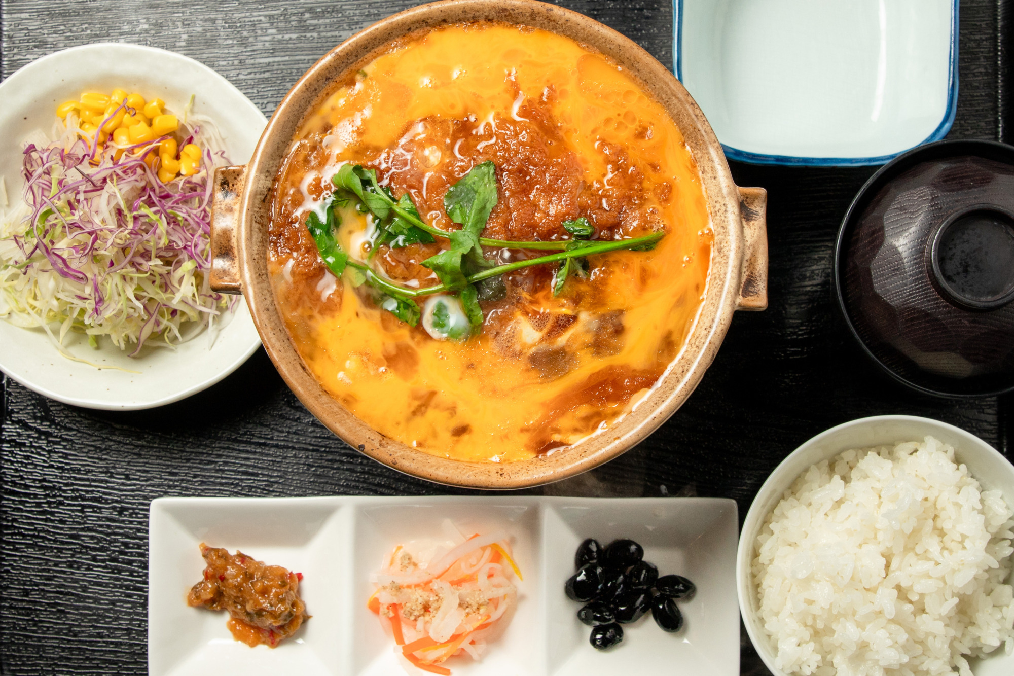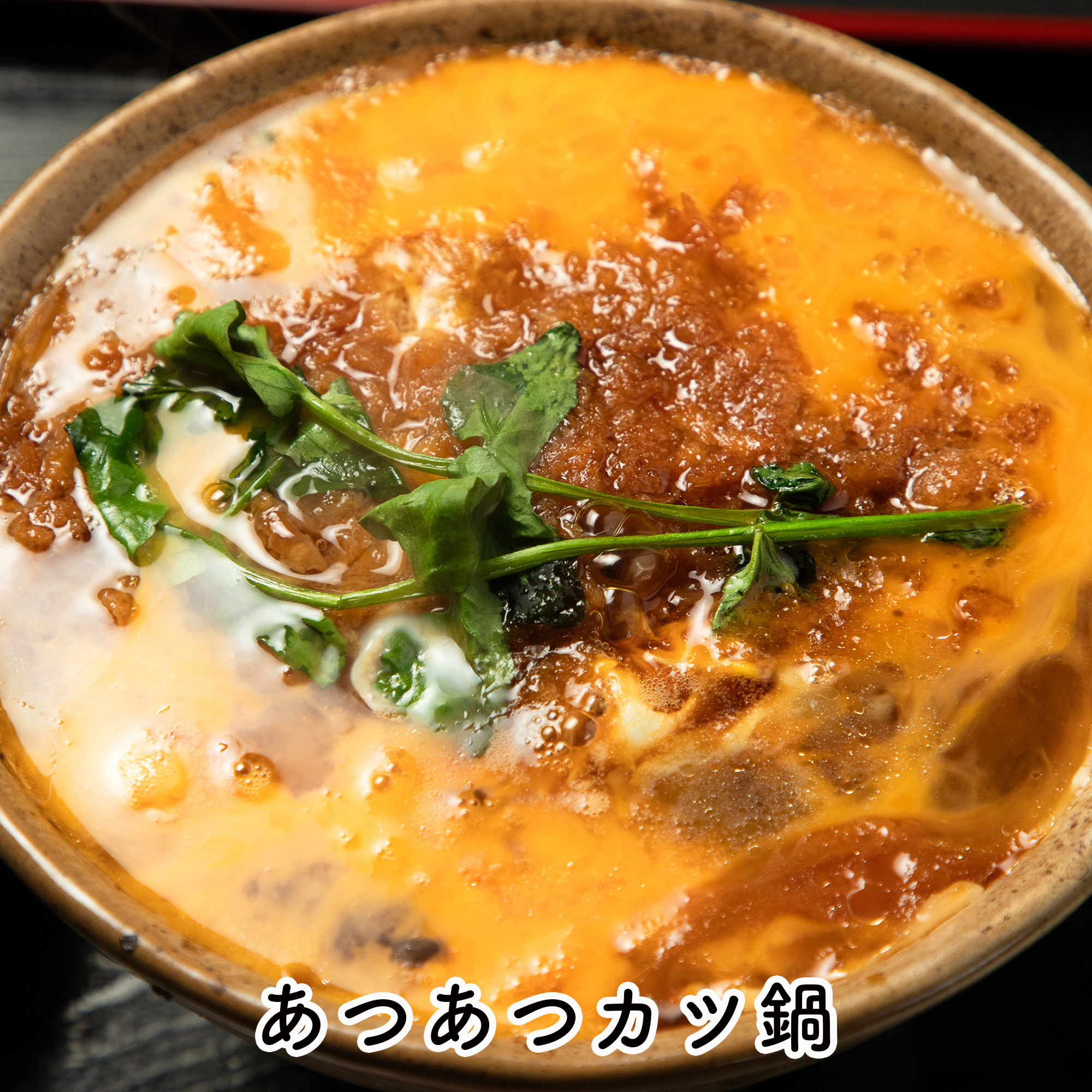定番人気メニューのカツ丼をあつあつ のままお召し上がりいただけるかつ鍋 でご用意しました。