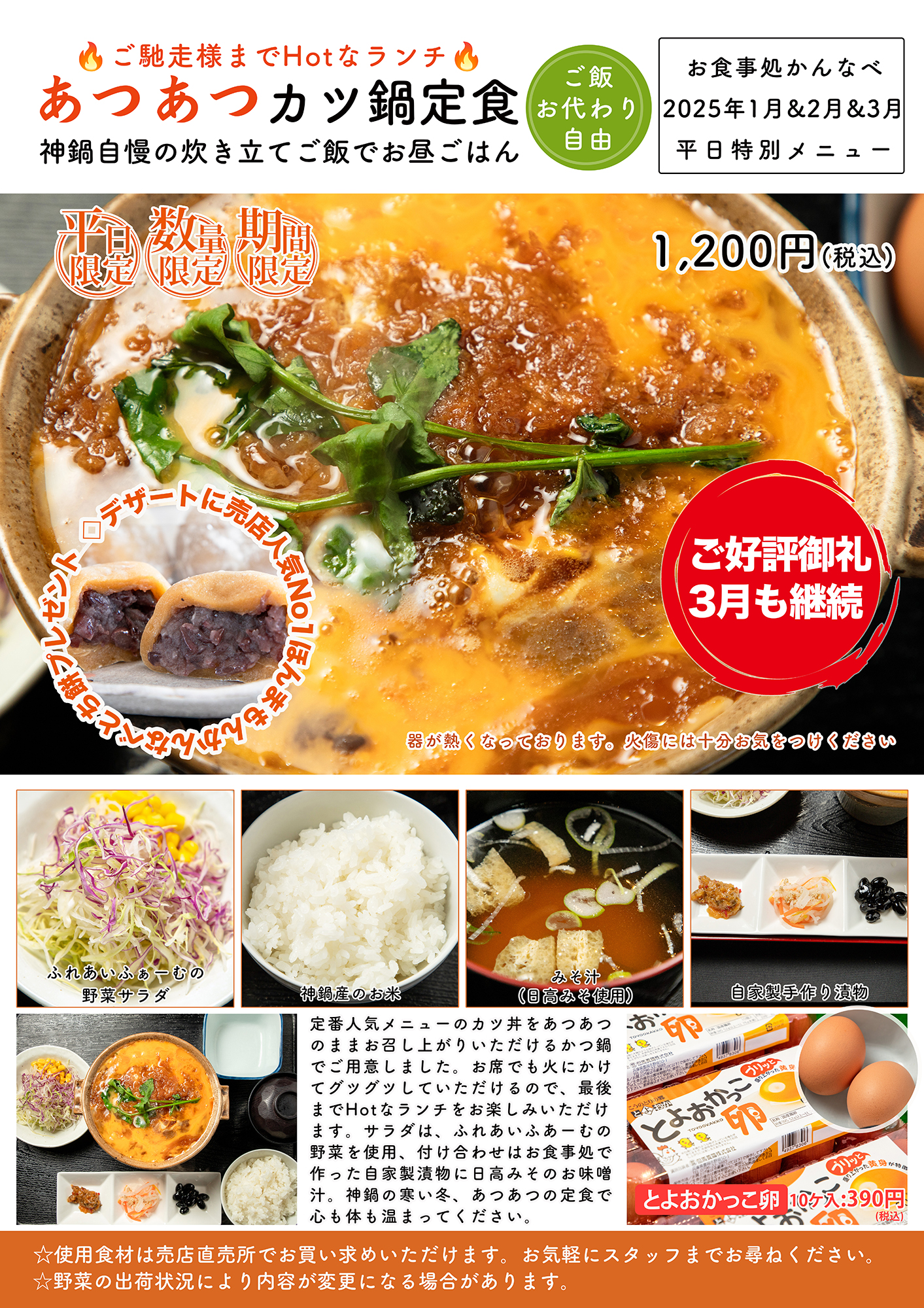 神鍋自慢の炊き立てご飯でお昼ごはん|🔥ご馳走様までHotなランチ🔥「 あつあつカツ鍋定食◇ご飯おかわり自由◇」<1月&2月&3月のお食事処かんなべ平日の特別メニュー>