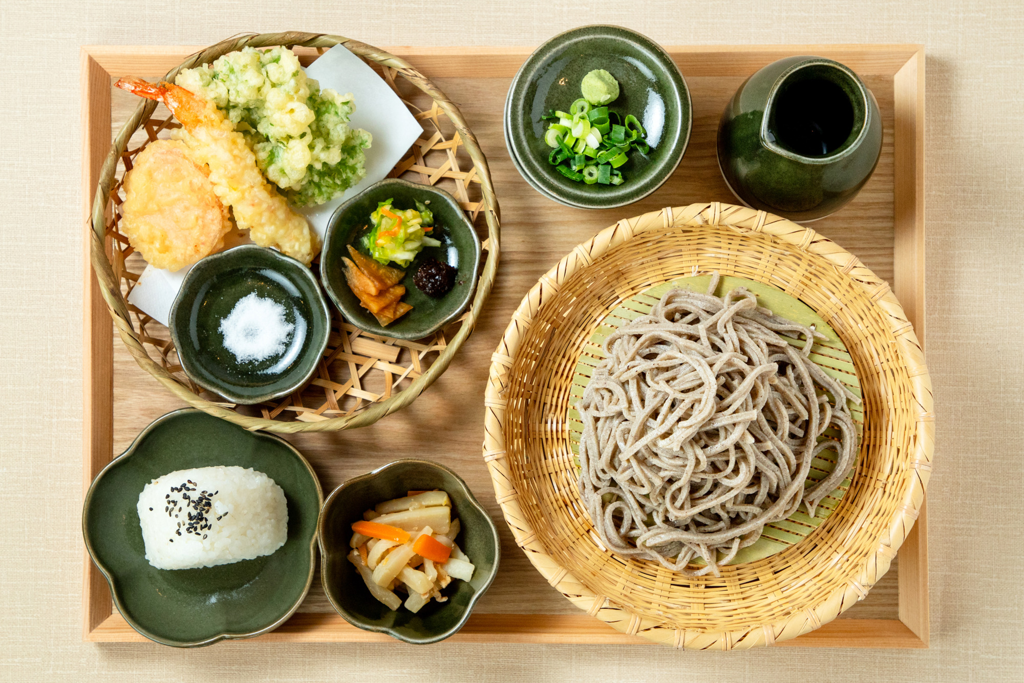 ◇神そば定食◇¥1,800-(税込) ・神そば ・秘伝の「かえし(各種調味料を調合)」を利用して作られた昔ながらの関西風つゆ ・彩も楽しい旬の地元野菜、山菜を使った天ぷら ・手作り漬物 ・神鍋高原自慢のお米で作ったおにぎり ・小鉢 ・薬味 ・お好みでお塩