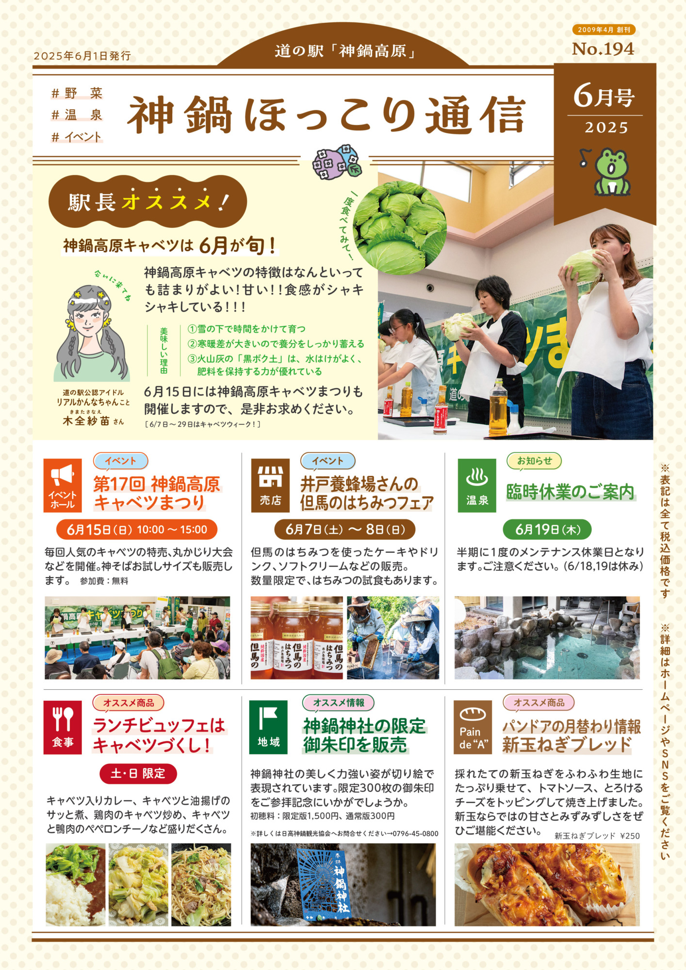 お知らせNews 2025.05.25 神鍋ほっこり通信/2025年6月号 毎月一回<道の駅神鍋高原>の嬉しい、美味しい、楽しい情報をお届けする「神鍋ほっこり通信」2025年6月号です。 BACK RELATED SITES 関連サイト SNS 神鍋高原の季節の情報をお届けします 月曜日、お疲れさまでした🍵 疲れた 兵庫県北部の年明けそばにどうぞ🦆 緑と白の神鍋高原 春から秋は、風に 【神鍋山ハイク】Kannabe Roots "さがす" 🍶 酒粕 好評販売中 毎年この時期に
