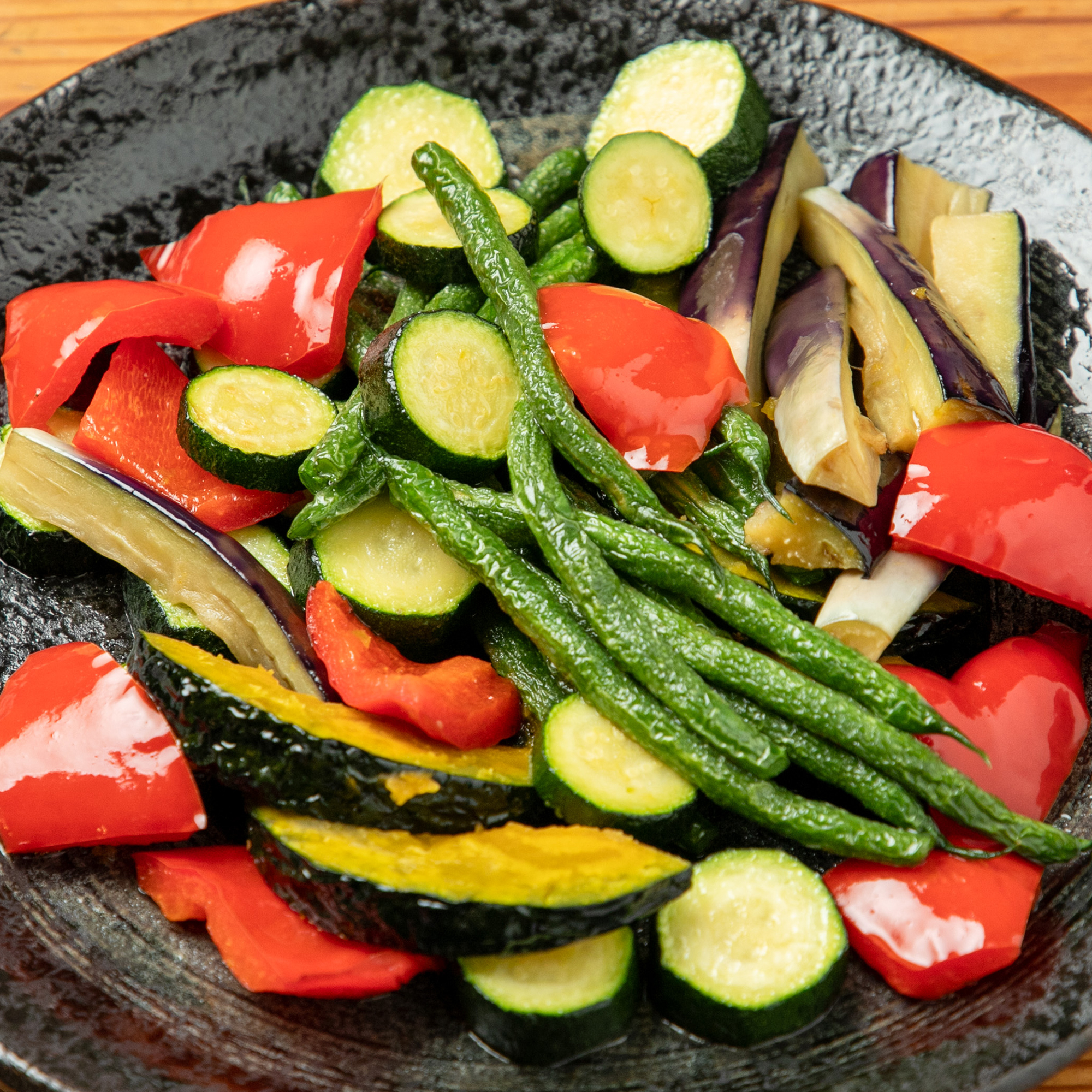 ふれあいふぁーむに沢山並んでいる夏野菜をたっぷり使った一品。夏野菜を素揚げにしてお出汁に漬け込みました。じゅわっと味しみしみで野菜が美味しくいただけます。