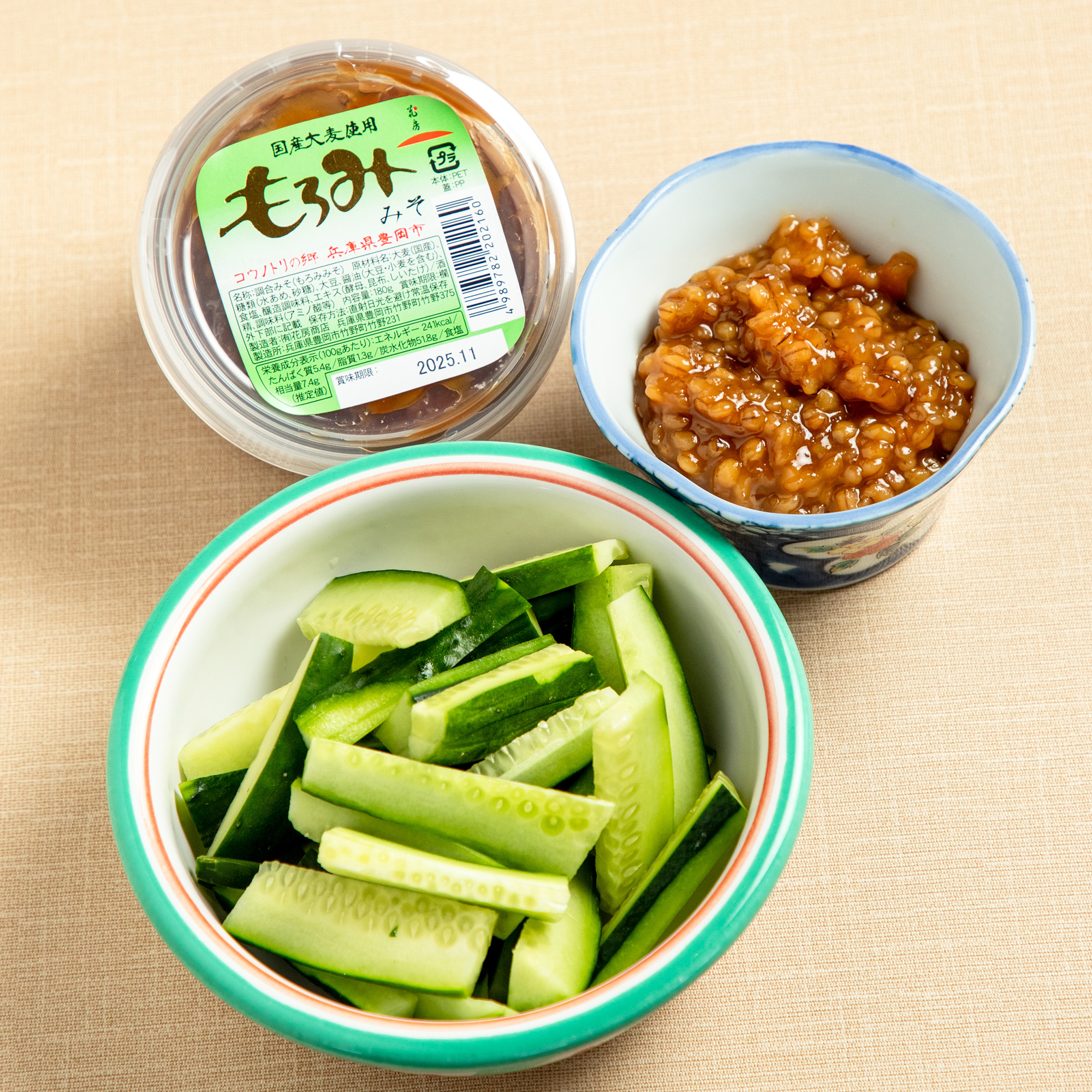 竹野の花房商店のもろみみそと一緒にきゅうりを味わってください。もろみみその甘じょっぱい味がきゅうりとよく合います。もろみみそは売店コーナーで販売中。