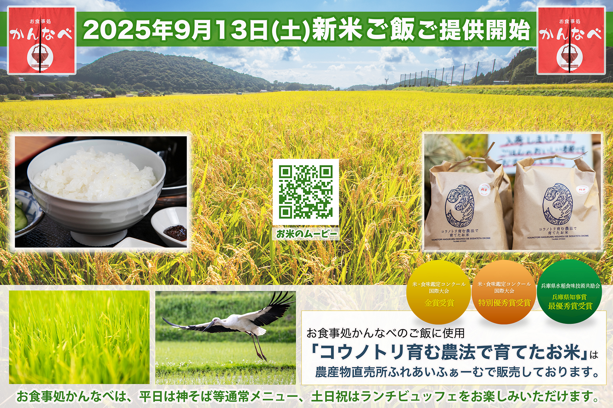 平日は神そば等通常メニュー、土日祝はランチビュッフェで営業中。お召し上がりいただけるご飯には、コウノトリ育む農法で育てたお米「神鍋産のツキアカリ」を使用(一部異なるメニューもございます)。