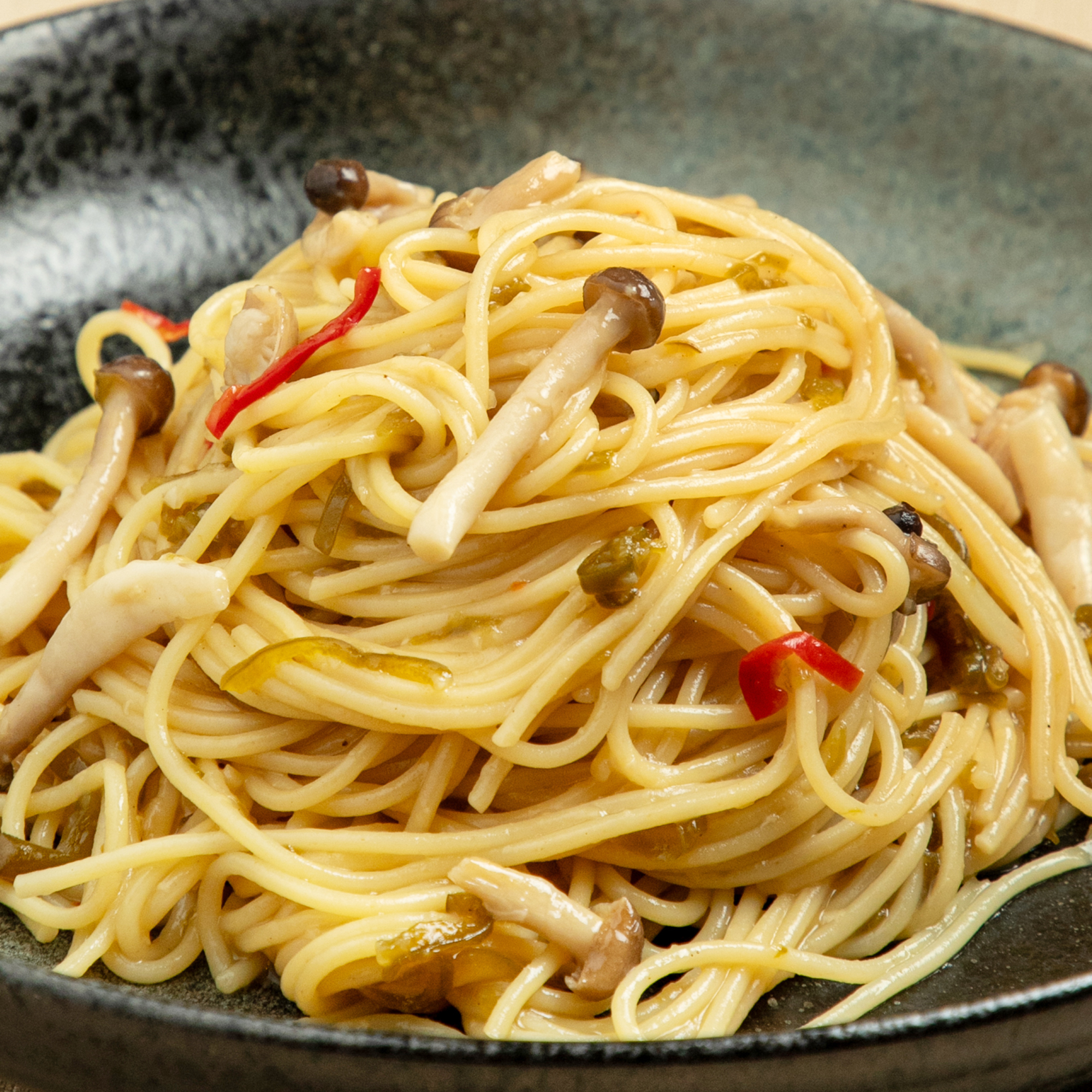 神鍋産ピーマンと米糀で作った「ピーマンみそ」、そしてきのこを合わせた、子どもも食べやすい少し甘めのパスタに仕上げました。