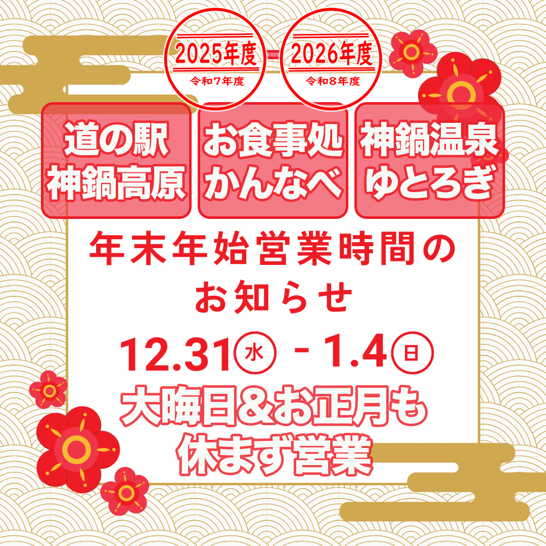 2025-2026<年末年始営業時間のお知らせ>大晦日&お正月も休まず営業【道の駅神鍋高原・お食事処かんなべ・神鍋温泉ゆとろぎ】