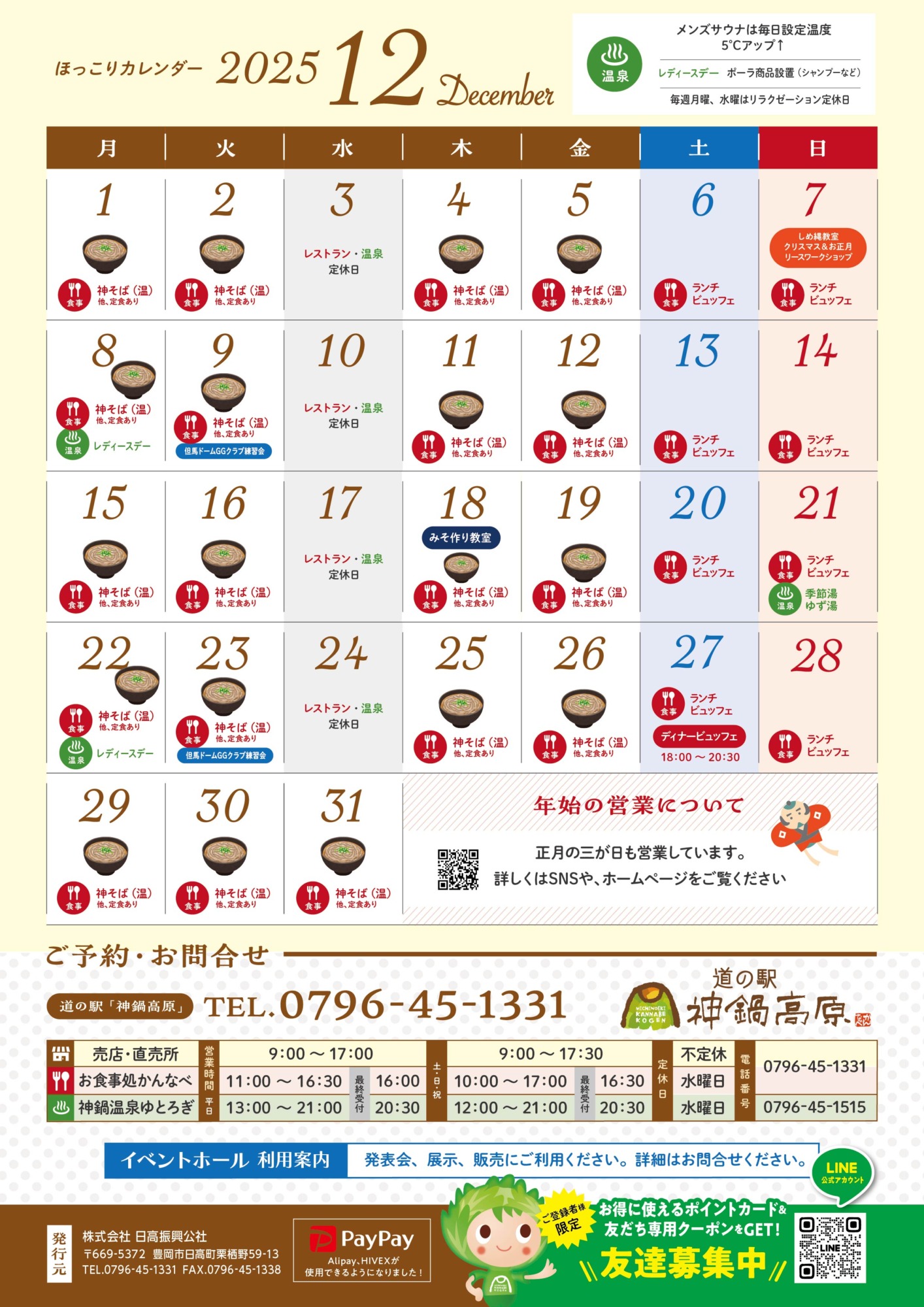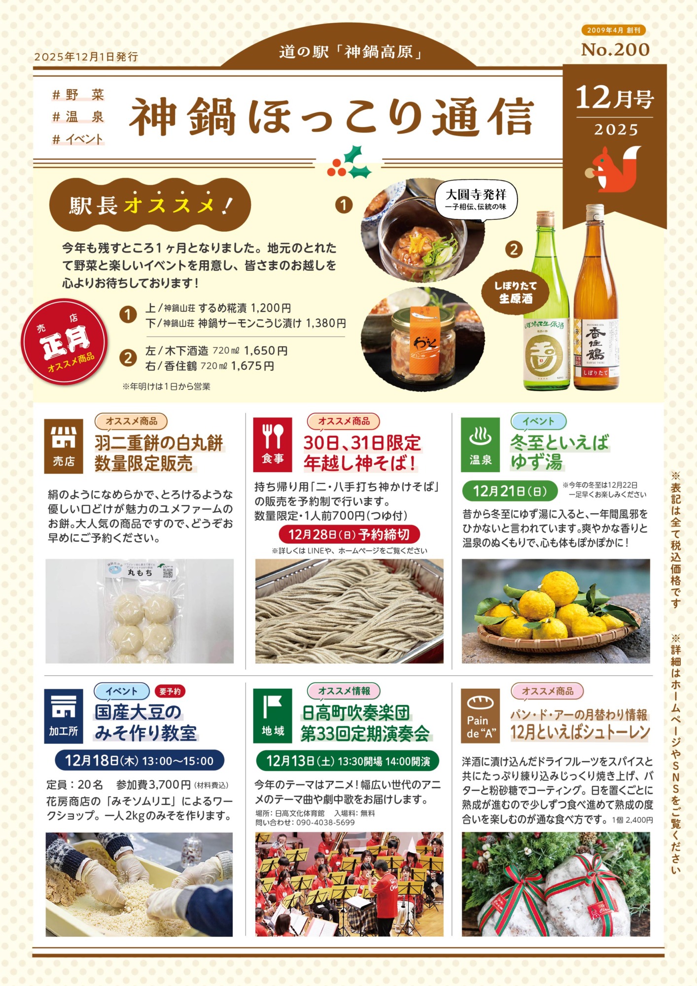 お知らせNews 2025.11.26 神鍋ほっこり通信/2025年12月号 毎月一回<道の駅神鍋高原>の嬉しい、美味しい、楽しい情報をお届けする「神鍋ほっこり通信」2025年12月号です。 今号には「年こし神そば」をはじめ、年末年始情報も掲載されております。冬の神鍋高原も、どうぞお楽しみください。 BACK RELATED SITES 関連サイト SNS 神鍋高原の季節の情報をお届けします お食事処かんなべ<12月の土日祝ビュ 2025年末から2026年始にかけての営業時 予約必須!2日間限定の鍋ディナー🔥