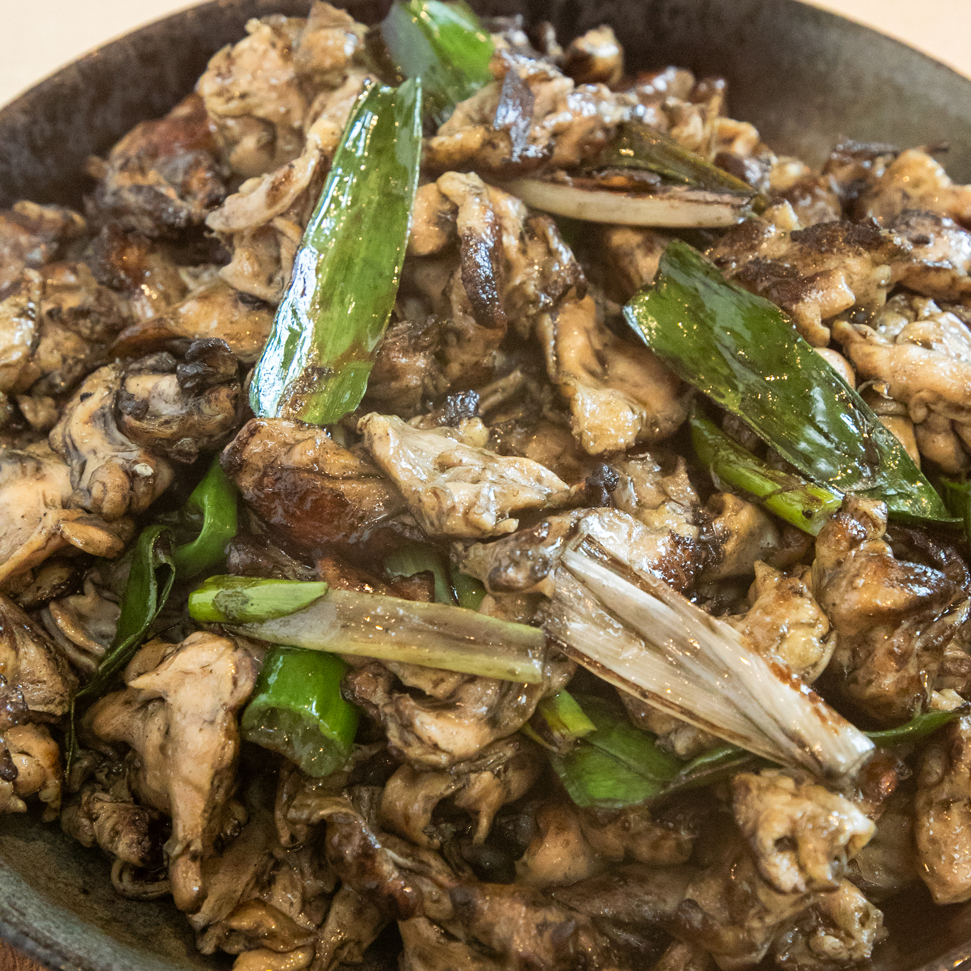 鶏肉のハラミとこれから旬を迎える神鍋のネギを一緒に炒めた美味しい一品です。