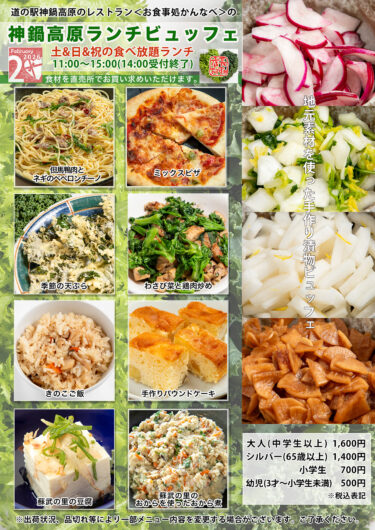 道の駅「神鍋高原」にあるレストラン**「お食事処かんなべ」**では、土日祝日限定のランチビュッフェを開催中。2026年2月は、冬の寒さで甘みを増した野菜や、但馬ならではの食材をふんだんに使ったメニューをご用意してお待ちしております。