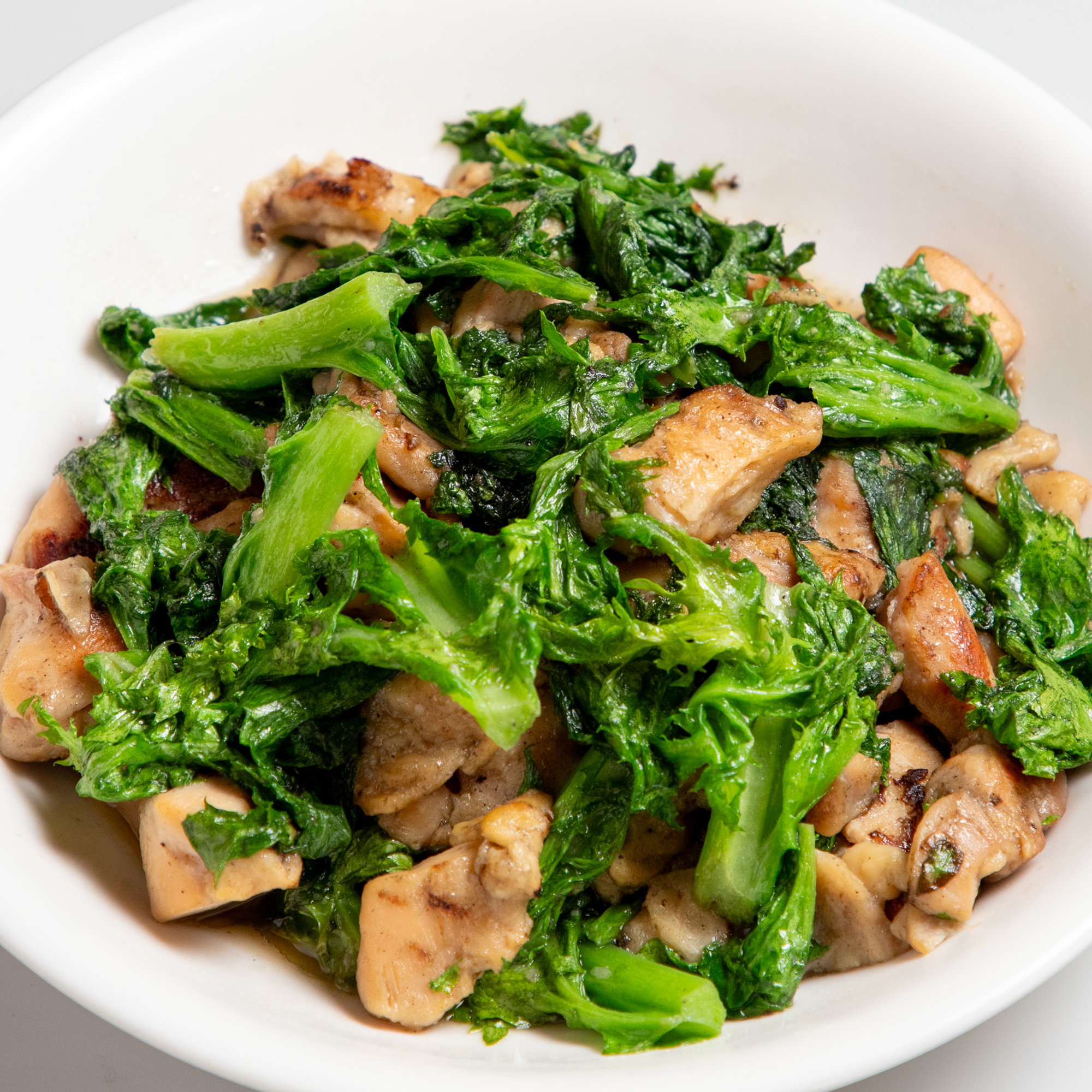 ピリッとした爽やかな辛味が特徴の「わさび菜」を鶏肉と一緒に炒めました。冬から春へと移ろう季節を感じさせる、ご飯が進む一品です。