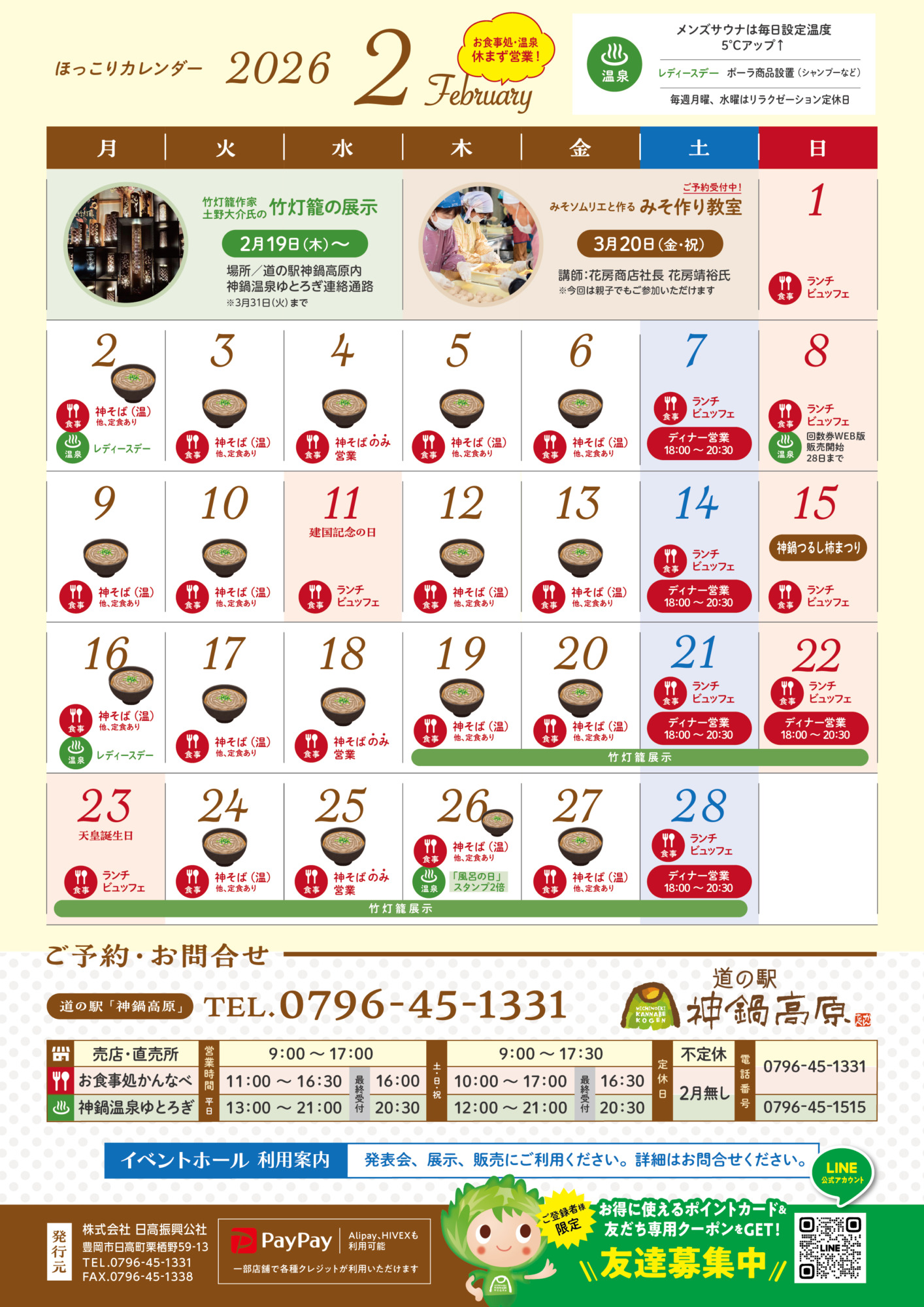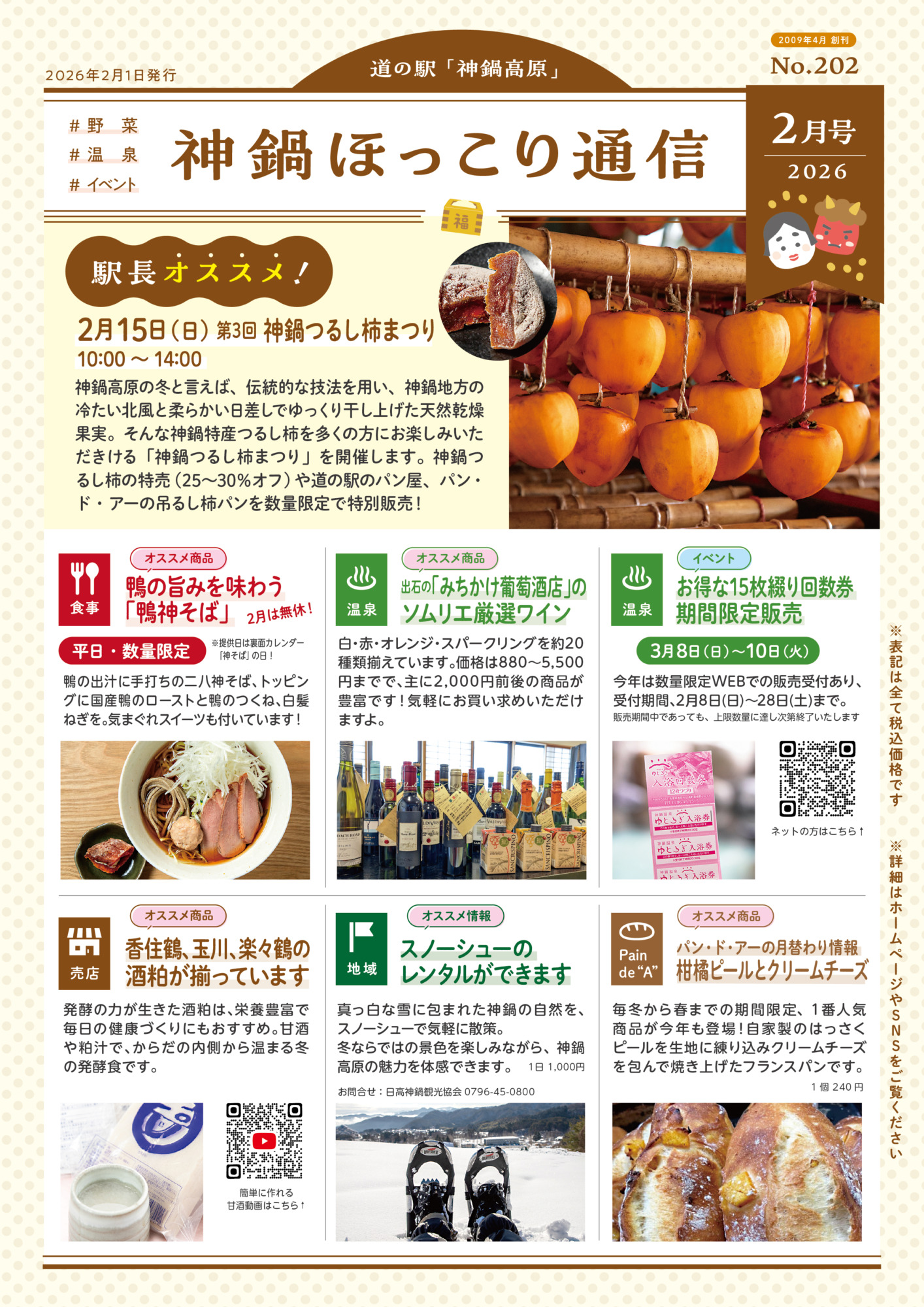 お知らせNews 2026.01.26 神鍋ほっこり通信/2026年2月号 毎月一回<道の駅神鍋高原>の嬉しい、美味しい、楽しい情報をお届けする「神鍋ほっこり通信」2026年2月号です。 ⭐︎2月15日(日)は神鍋つるし柿まつりを開催します。冬の神鍋高原の食イベントです。ぜひお越しください。 ◇画像をタップorクリックで拡大表示できます。 BACK RELATED SITES 関連サイト SNS 神鍋高原の季節の情報をお届けします 🌸 神鍋高原周辺の桜が、満開に向かっています。 桜速報 2026.4.2 今週末・来週末のお出か Instagram3000人フォロワー達成祈念☆抽選ライブ配信です 桜咲く神鍋高原でお召し上がりください。 🌸春のお花見ソフトクリーム🌸 4/4(土)・4/5(日)の2 🎉✨ フォロワー3,000人達成記念プレゼント企画 ✨🎉 4月2日(木)12:00〜 ライブ配信にて 改装工事期間&月曜限定🌿 但馬どりの満菜(まんさい)ラーメン 野菜マシマシトッピング無料サービス始め 春ランチに、ボリューム満点のサンドをどうぞ🥖 塩コショウとレモンで焼いた新鮮サーモンが、クリームチー \ 全国どこからでもお買い物できます / 「あのお気に入りの商品が欲しいけど、道の駅にはなかなか行け 雪溶けの神鍋高原へ、春のランチビュッフェを食べに行こう! 高原の自然に囲まれた「お食事処かんなべ」 プレミアム付商品券「PREMIUM豊岡2026」が道の駅神鍋高原でご利用いただけます。 8,000円 この三連休、売店にきたらポップを探してみてください🔍 スタッフ3チームが、それぞれ「これを買ってほし