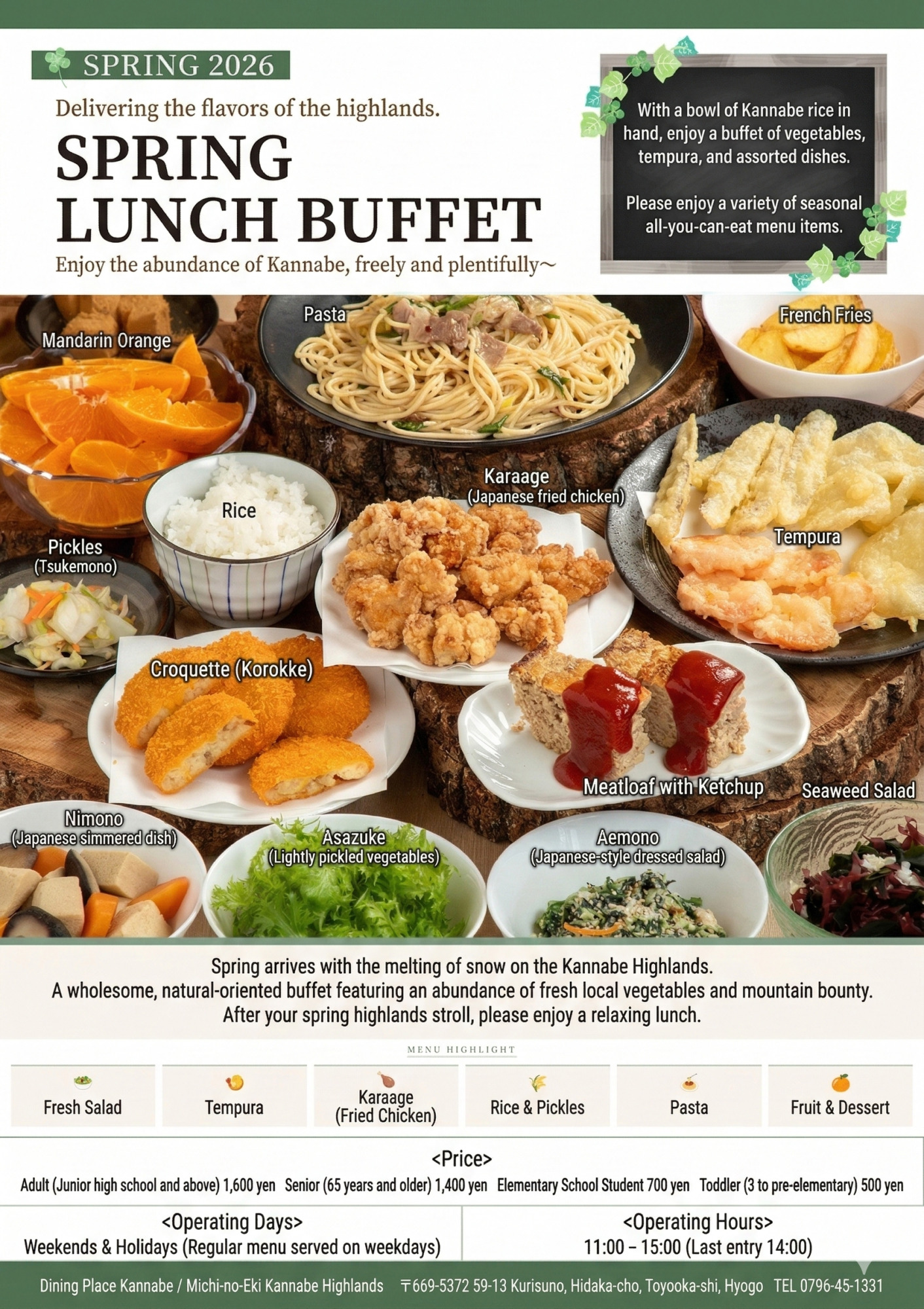 道の駅「神鍋高原」にあるレストラン「お食事処かんなべ」では、土日祝日限定のランチビュッフェを通年開催中。春は、神鍋高原の恵みをふんだんに使った自然派・健康派メニューをご用意してお待ちしております。