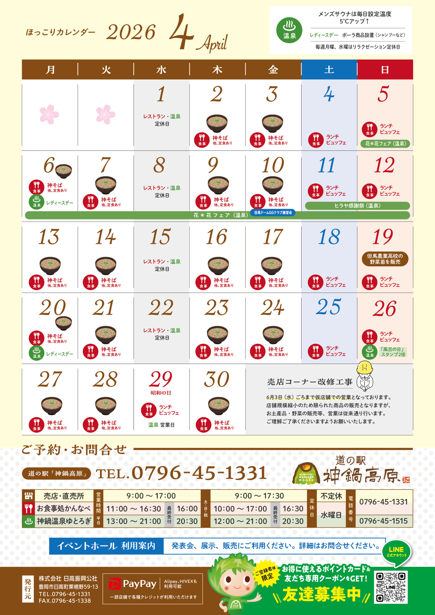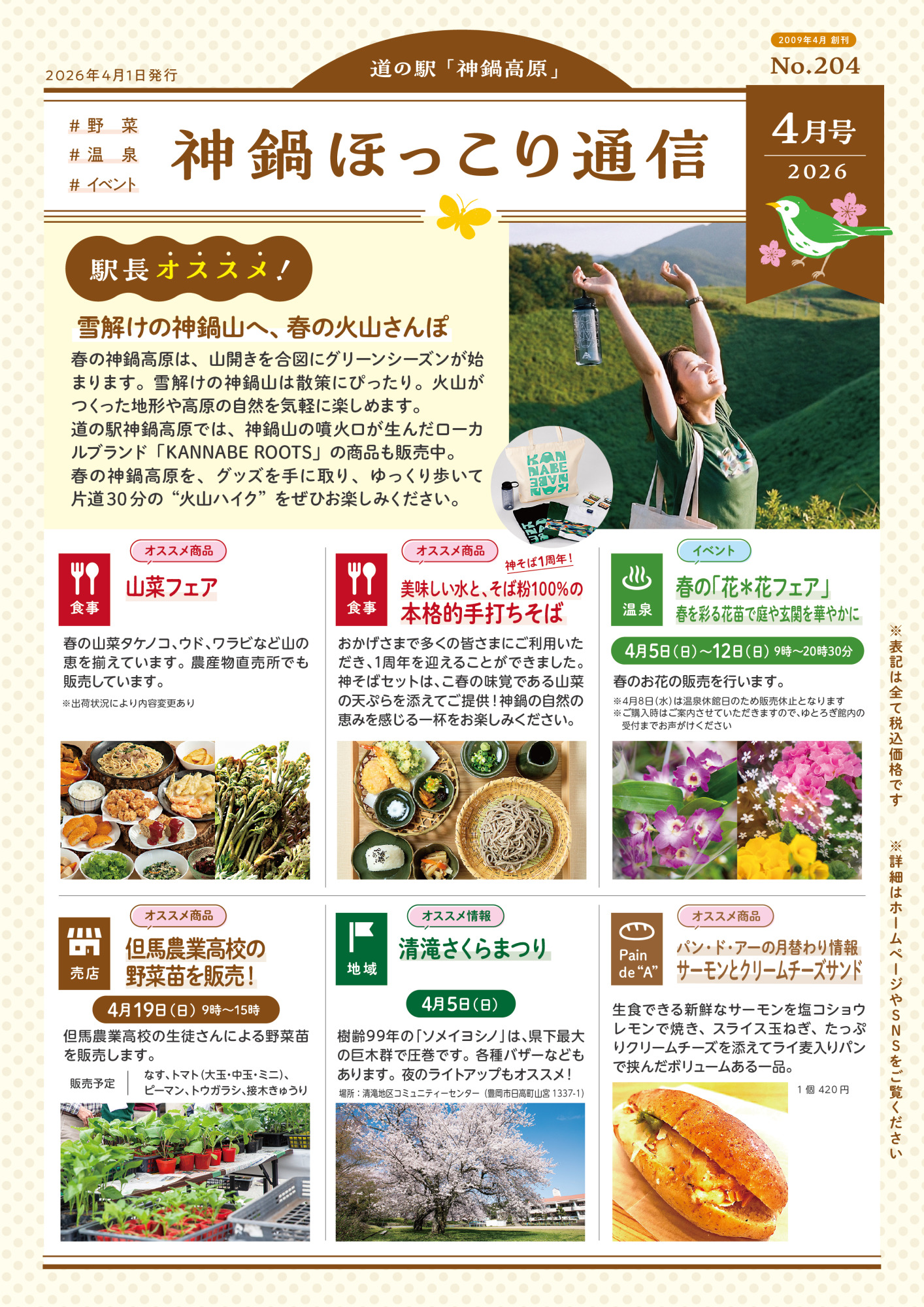 毎月一回<道の駅神鍋高原>の嬉しい、美味しい、楽しい情報をお届けする「神鍋ほっこり通信」2026年4月号です。