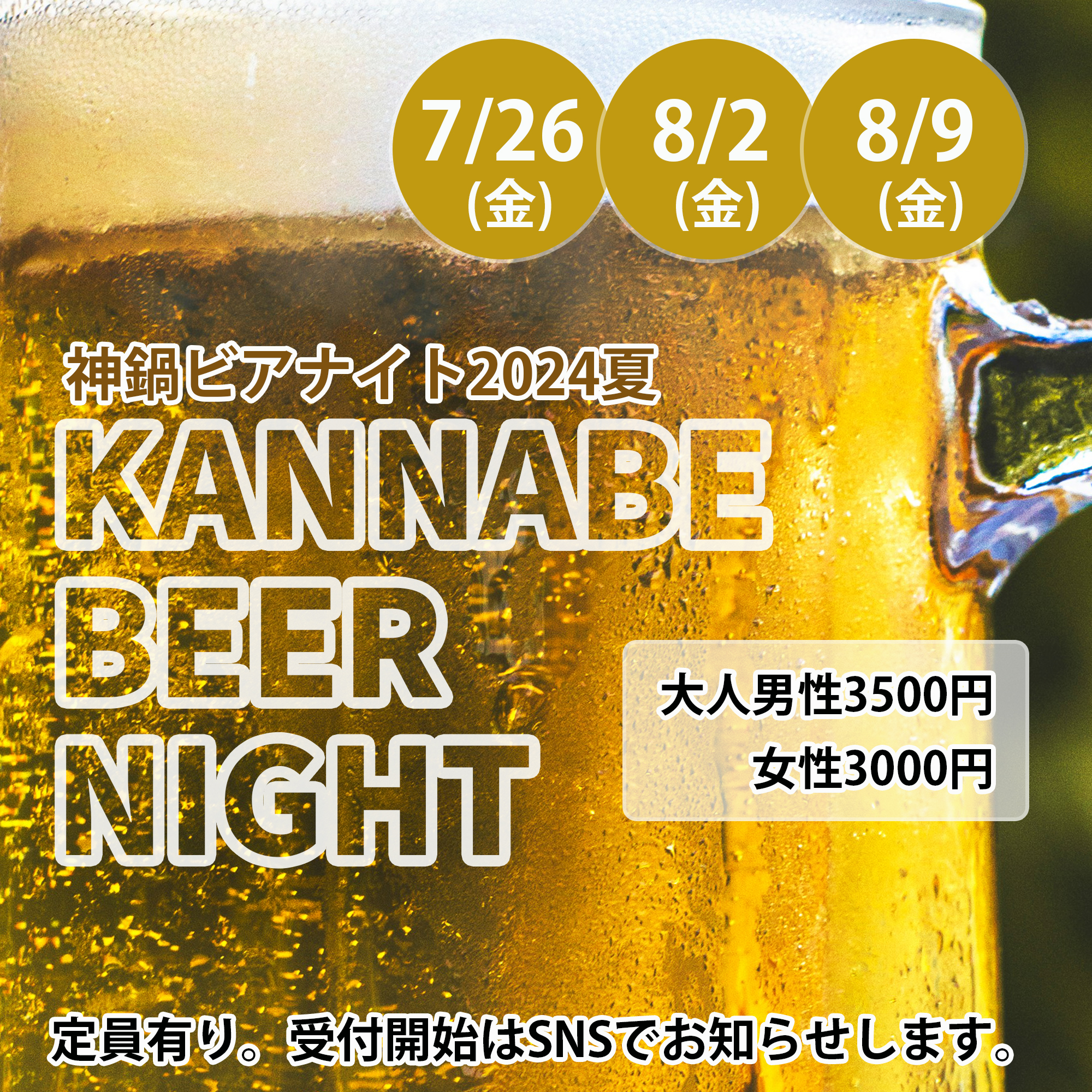 開催日は7/26、8/2、8/9の金曜日3回。大人男性3500円&女性3000円。