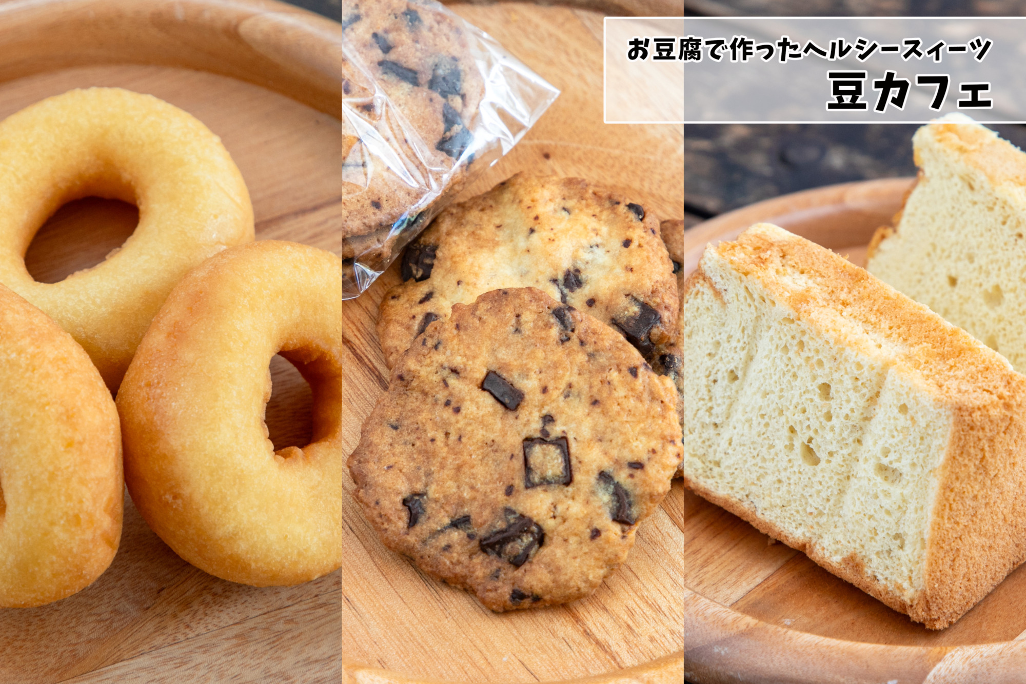 内容:豆乳ドーナツ(3個入り300円)・お豆腐のシフォンケーキ(1つ180円)・おからクッキー(3枚入り150円)