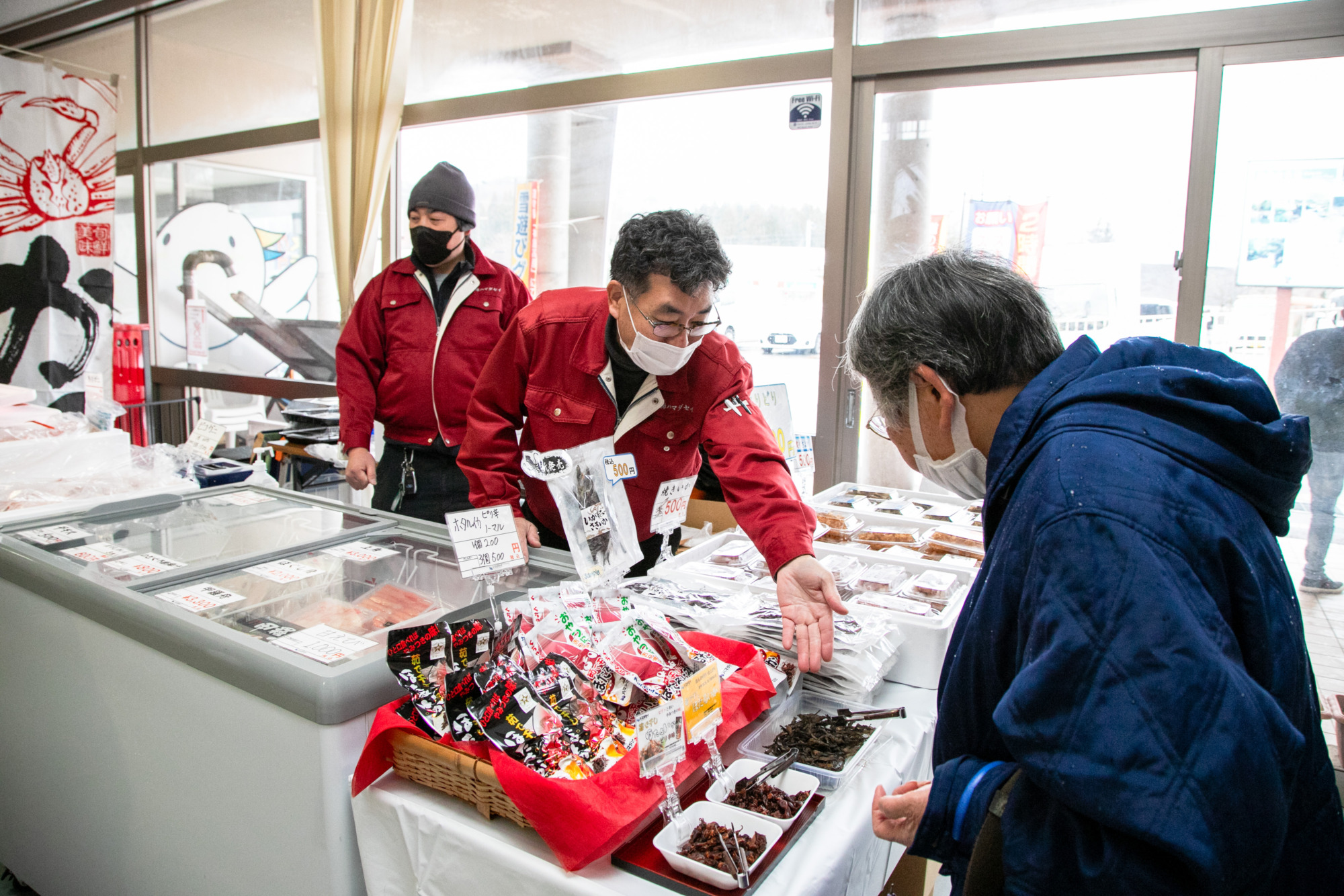 旬のカニや、カレイ・はたはた・スルメなどの干物を販売します。