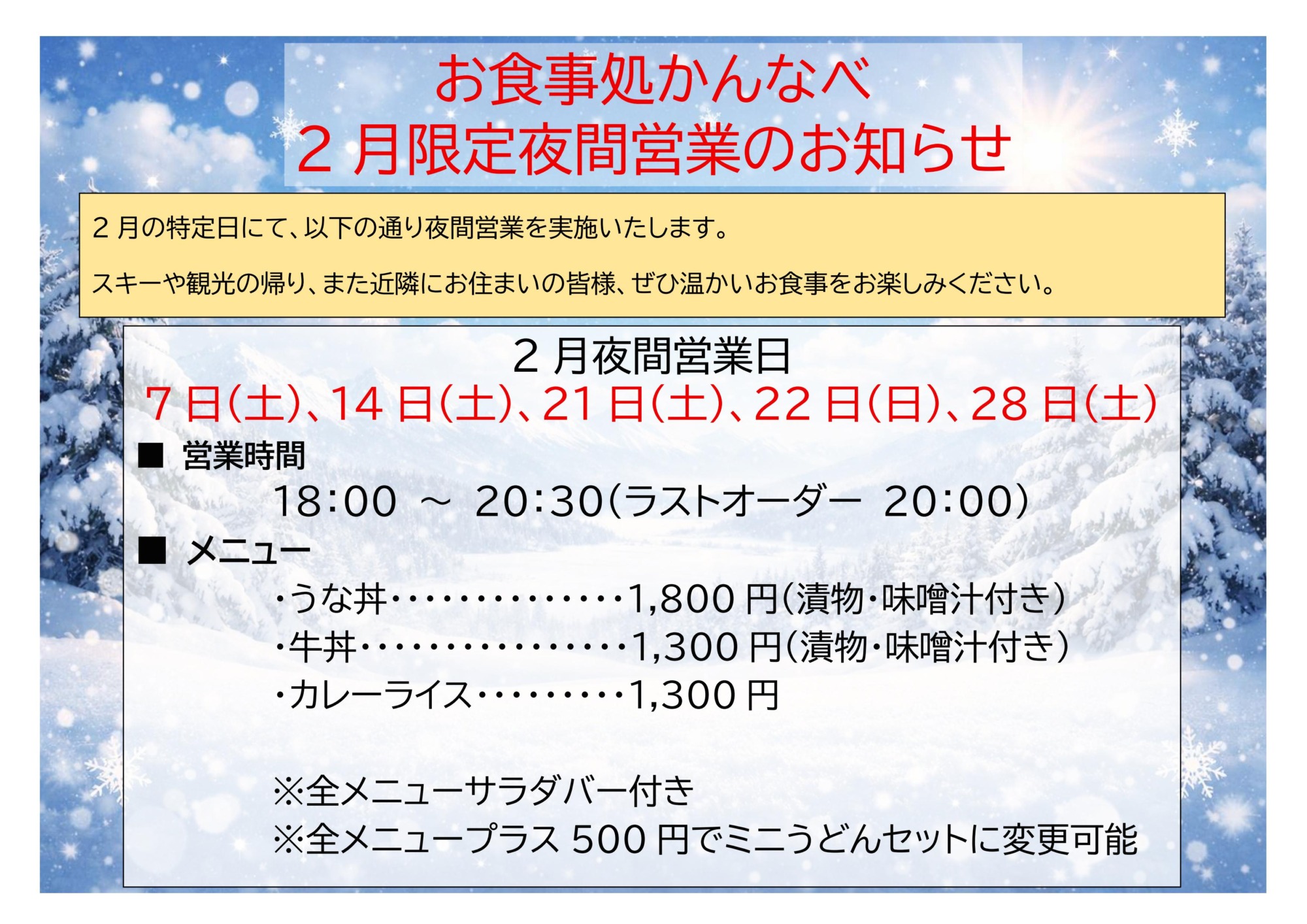 2月限定夜間営業のお知らせ<お食事処かんなべ>