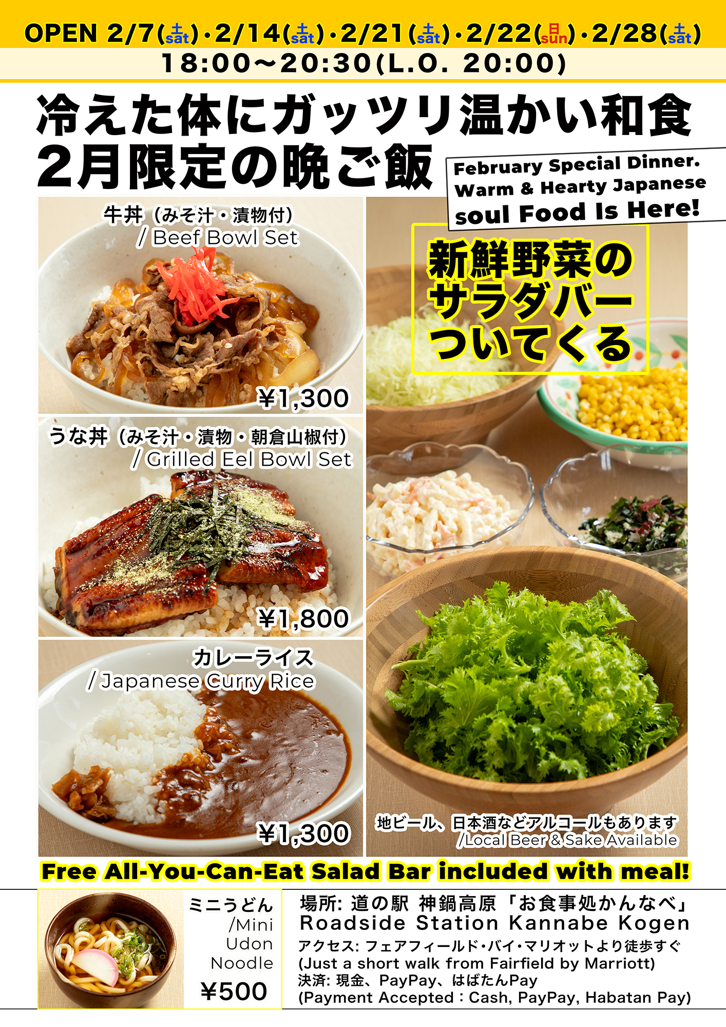 神鍋高原の夜を温かく。2月限定ディナー営業オープン!【サラダバー付き】 Warm up your night in Kannabe! February Special Dinner is NOW OPEN with Free Salad Bar
