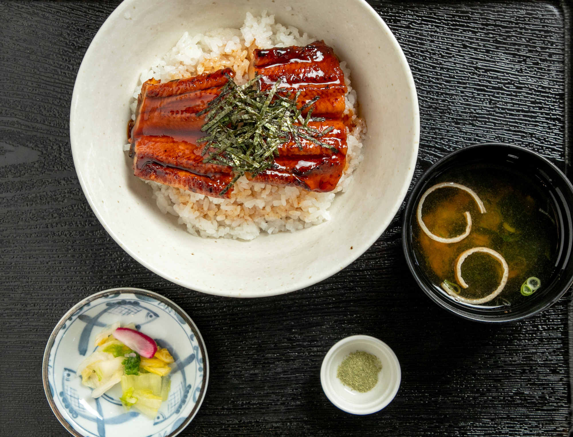 Grilled Eel Bowl Set (Unadon) … ¥1,800 (お味噌汁・お漬物・朝倉山椒・サラダバー付き)