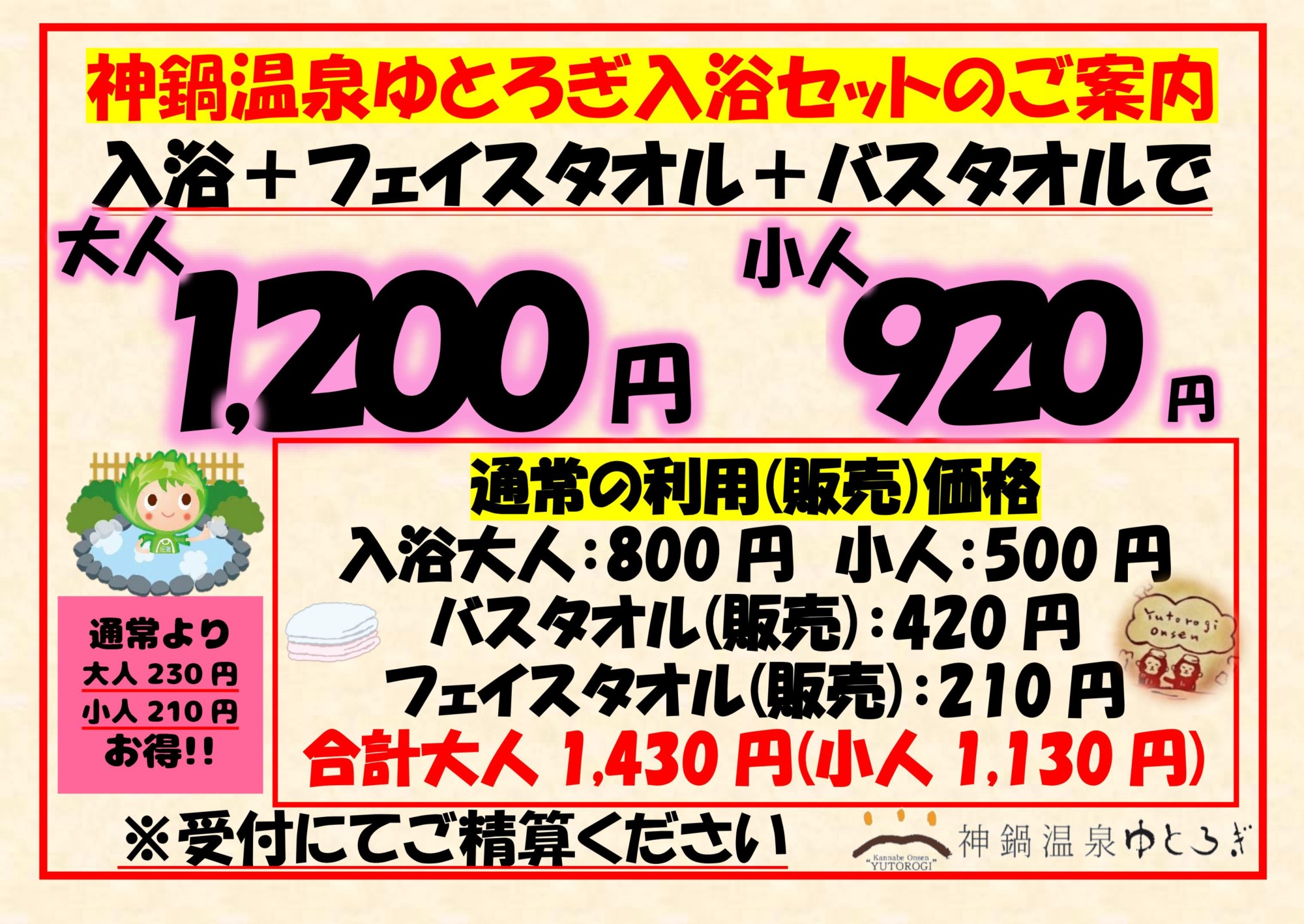 | アメニティ | ハンドタオル(ゆとろぎデザイン) 210円 バスタオル(無地) 420円 ※備付けでボディソープ・シャンプーあり |