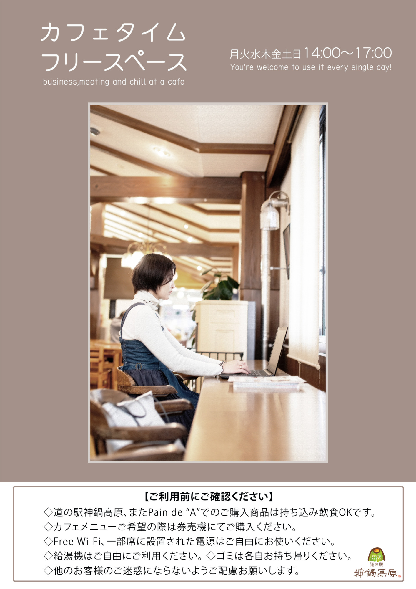 お食事処かんなべ(道の駅神鍋高原内)では2024年3月1日(金)よりレストランの1区画を無料の共有スペースとしてご提供させていただきます。ご利用いただける時間帯は、月曜から日曜まで毎日14:00〜17:00の3時間になります。ご予約の必要はございません(席数には限りがあります)。以下内容ご確認のうえ、お気軽にご利用ください。