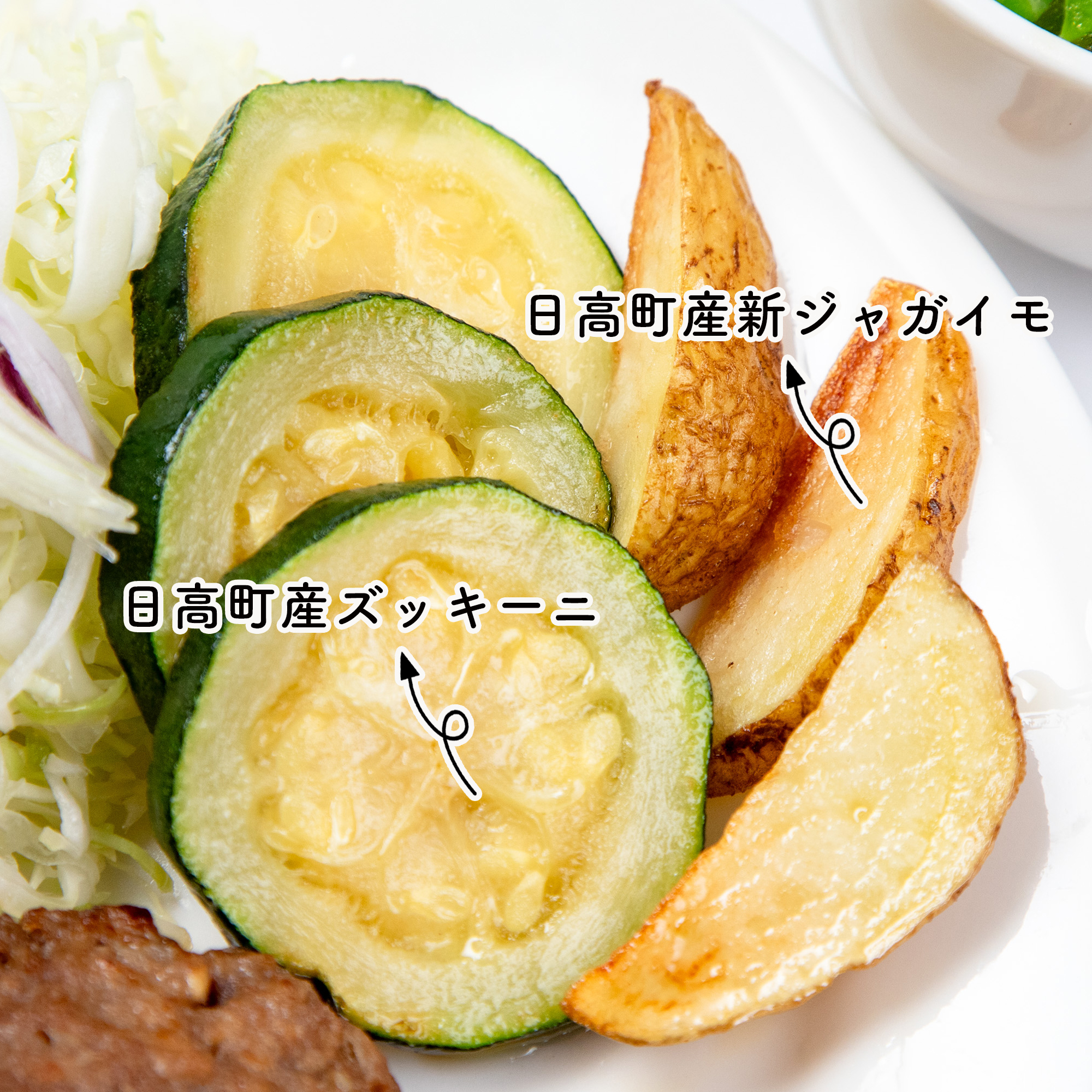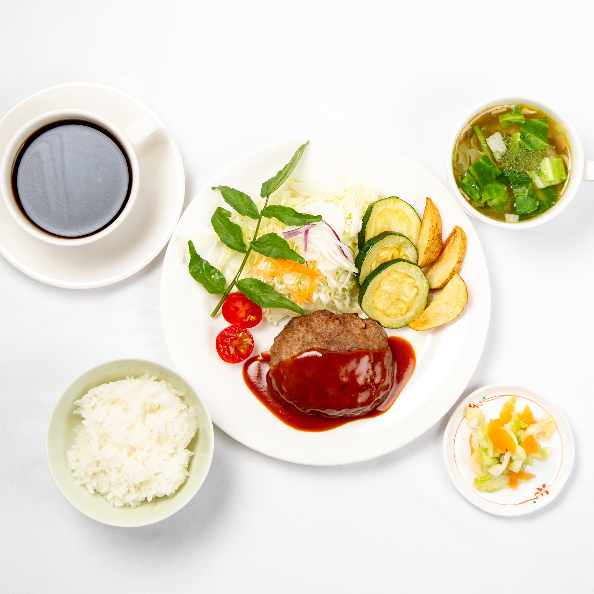 今が旬のキャベツを中心に、この時期に直売所に出荷されている野菜をハンバーグの付け合わせにして、神鍋高原キャベツのコンソメスープと漬物、そしてコーヒーをセットにしました。子供も大人も大好きなハンバーグ、素揚げにしたズッキーニ、ホクホクの皮つき新じゃがいも、甘くてシャキシャキの神鍋高原キャベツ、今が旬の野菜をたっぷりと召し上がれ。セット料金1,200円(税込)。