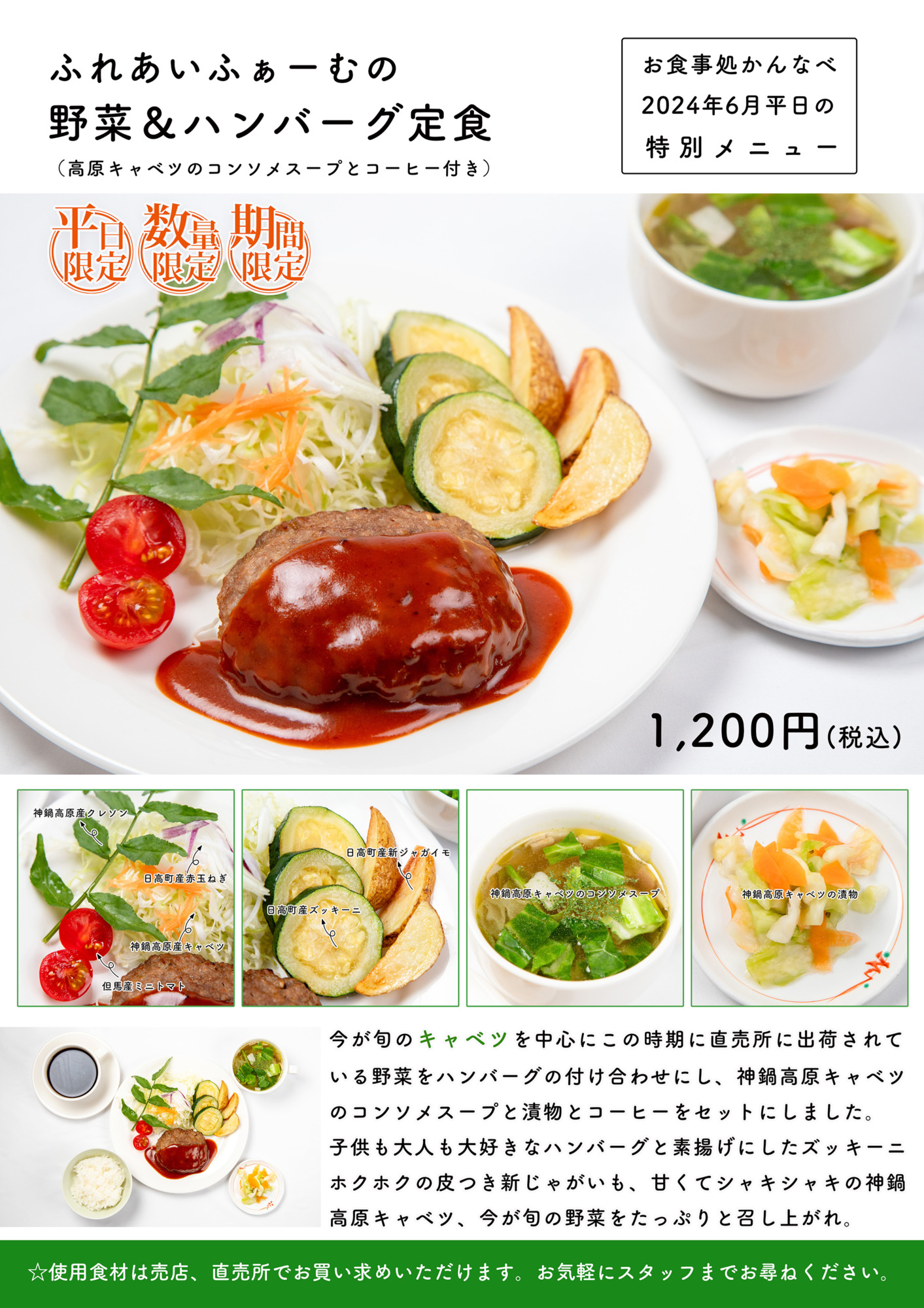 ふれあいふぁーむの野菜&ハンバーグ定食(高原キャベツのコンソメスープとコーヒー付き)<6月のお食事処かんなべ平日の特別メニュー>