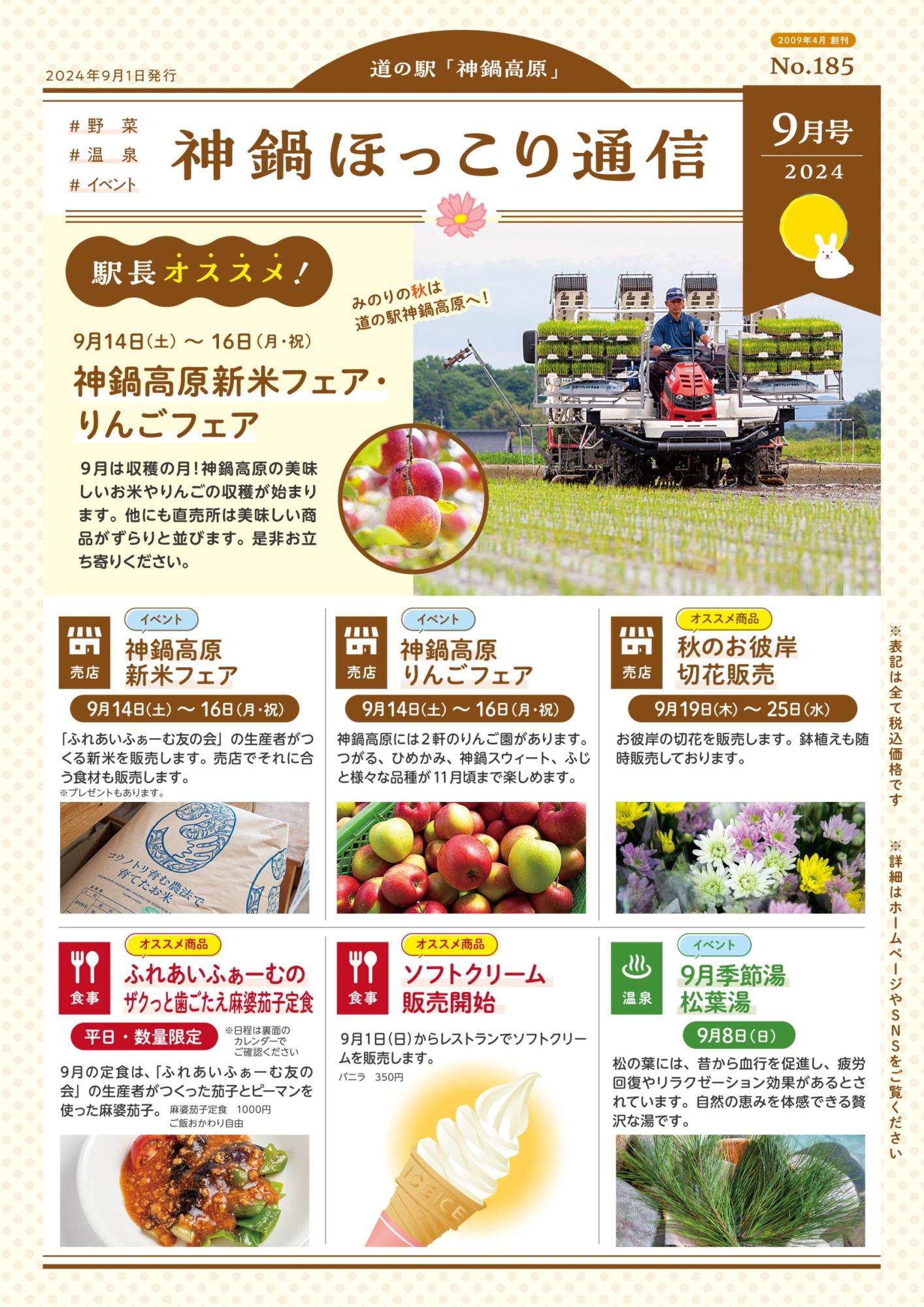 お知らせNews 2024.08.29 神鍋ほっこり通信/2024年9月号 毎月一回道の駅神鍋高原の嬉しい、楽しい、美味しい情報をお届けする「神鍋ほっこり通信」2024年9月号です。 BACK RELATED SITES 関連サイト SNS 神鍋高原の季節の情報をお届けします 「Let's nail this landing!」 「この着氷をバッチリ決めよう!」 神鍋高原か 近畿でここだけ。 噴火口が生んだローカルブランド「KANNABE ROOTS」 兵庫県豊岡市、神鍋 【2/14(土)当日限定!バレンタイン特別企画🍫🍦】 神鍋高原で愛される「ヒラヤミルク」ソフトが、 【2/15限定】冬の神鍋、一番甘い1日。 神鍋高原の冷たい北風と秋の日差しが作り上げた、天然の宝石 神鍋温泉ゆとろぎより、年に一度の特別回数券販売のお知らせです♨️ 日頃よりご利用いただいているお客 \ 2月は毎日オープン!昼も夜も「道の駅」へ ❄️ / 神鍋高原で冬を満喫中の皆さまに、 お食事処か 【2月限定】神鍋の夜⛄️🍲 新鮮野菜のサラダバー付きディナー、オープンします! 「スキーのあと、 神鍋高原は一面の雪景色。 寒さで冷えた体に、温かいご飯が恋しくなる季節です⛄️ そんな今の時期にぴ KANNABE ROOTS #神鍋高原 #道の駅神鍋高原 #神鍋山 春が来たら噴火口で「絶景ピクニック」しませんか?🥪🌋 <木箱に詰まった宝物>画像のお弁当は、神鍋山