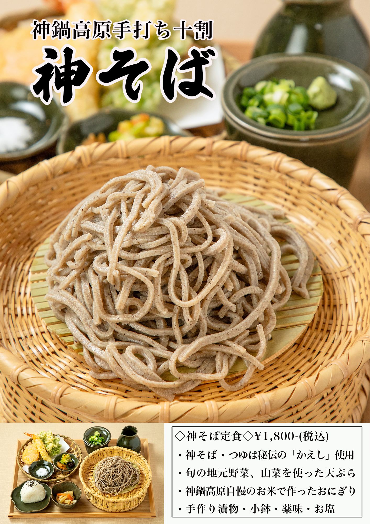 「新そば」は、 そばの実を収穫してからおよそ 1〜2ヶ月の間に打たれる旬のそばです。 新そばならではのみずみずしい香りと澄んだ 風味が特徴。そば本来の香りと食感を一口 ごとにお楽しみいただき、地元の景色と共に 「神そば」の味をぜひご堪能ください。