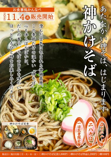 お知らせNews 2025.10.31 あたたかい神そば、はじまります<神かけそば>2025年11月4日(火)販売開始 あたたかい神そば、はじまります <神かけそば>2025年11月4日(火)販売開始 澄んだ空気に包まれる神鍋高原。 この季節だけの温かい「神そば」 心も体もぽかぽかに、 だしの香り、そばの旨みを味わい ほっとするひと時をお楽しみください。 ◇神かけそば定食 1,800円(税込) ・神かけそば ・彩も楽しい旬の地元野菜、山菜を使った天ぷら ・ご飯(神鍋高原自慢のお米) ・とろろ ・手作り漬物 ・小鉢 ・お塩 ・卵:別売り 100円(税込) ◇神かけそば単品 1,200円(税込) ・神かけそば ・小鉢 ・卵:別売り 100円(税込) BACK RELATED SITES 関連サイト SNS 神鍋高原の季節の情報をお届けします 竹の光がつなぐ、冬の静寂と春の芽吹き🎋 竹灯籠作家・土野大介氏の作品展を開催中。 約60点の竹灯籠 工事中でも、お食事処かんなべは元気に営業中🍜 「どこから入るの?」そんな疑問は動画でまるっと解決! 神鍋高原に、春がやってきます 🌿 雪解けとともに芽吹く高原の恵みを 好きなものを好きなだけ、食べ放題 🏪 本日より、仮設店舗で営業スタート! 2/27(金)から、売店・直売所が仮設店舗にて営業を開始し 🍞 道の駅神鍋高原のパン屋さん 「Pain de “A”(パンドアー)」、知ってますか? 「神鍋の 🔨 道の駅神鍋高原、リニューアル工事のお知らせ! ご不便をおかけしますが、工事中も道の駅は元気に営 焚き火の夜に、自然の酒を。🔥 日本初のリジェネラティブ・オーガニック認証を取得したパタゴニア プロビ 「Let's nail this landing!」 「この着氷をバッチリ決めよう!」 神鍋高原か 近畿でここだけ。 噴火口が生んだローカルブランド「KANNABE ROOTS」 兵庫県豊岡市、神鍋 【2/14(土)当日限定!バレンタイン特別企画🍫🍦】 神鍋高原で愛される「ヒラヤミルク」ソフトが、