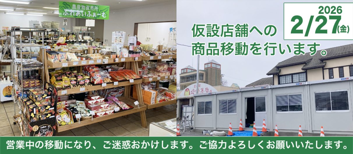 2月27日(金)の12時前後より、売店・直売所の商品を仮設店舗へ移動します。営業中の移動となりますため、ご迷惑をおかけいたします。何卒ご理解・ご協力をお願いいたします。
