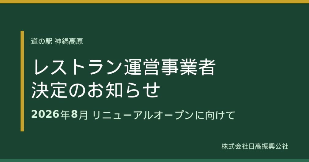 株式会社日高振興公社では、道の駅「神鍋高原」内レストランの運営に関する公募を実施いたしました。慎重な審査を行った結果、「ペンシオーネキタムラ」社を本公募の採択予定者として決定いたしました。