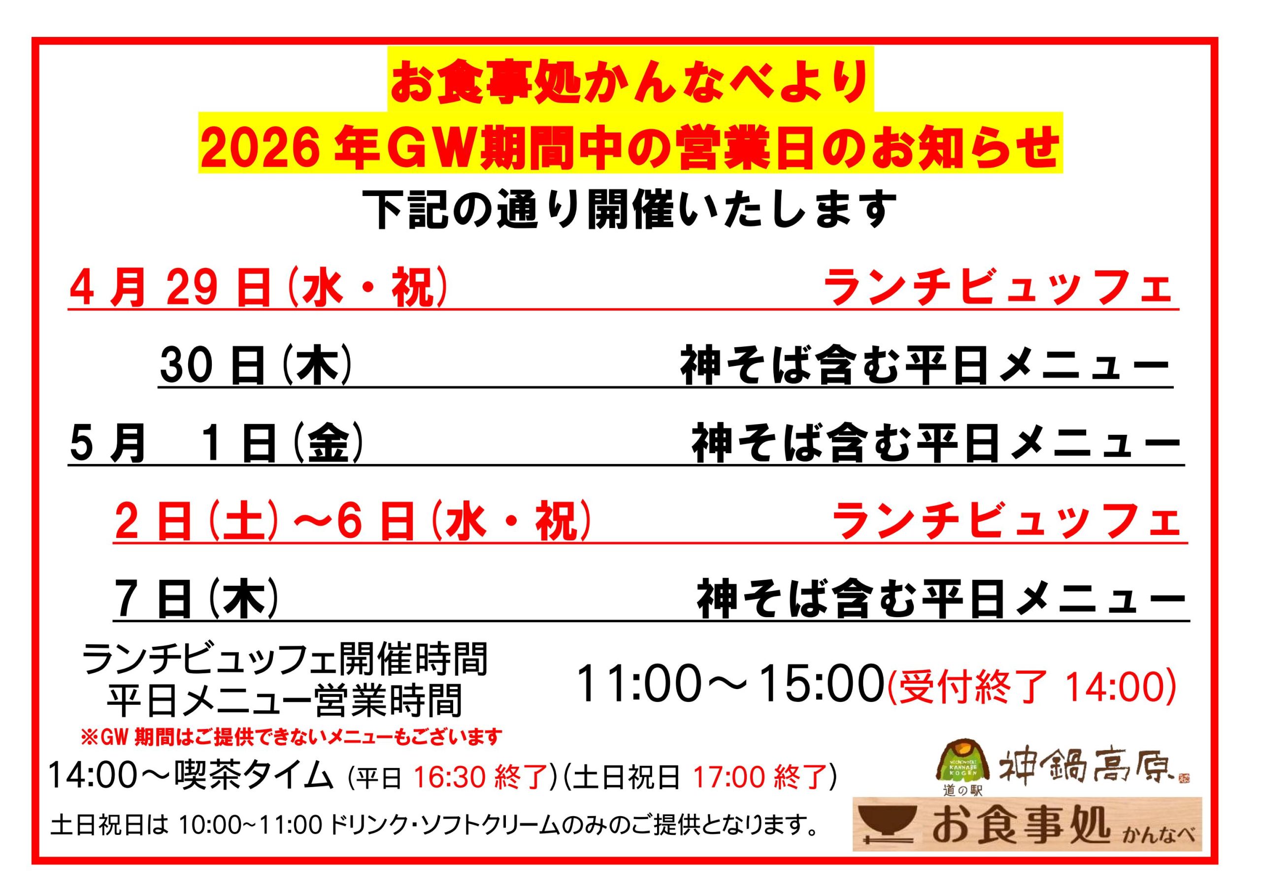 | 5月7日(木) | 神そば含む平日メニュー | 11:00~15:00(受付終了14:00) |
