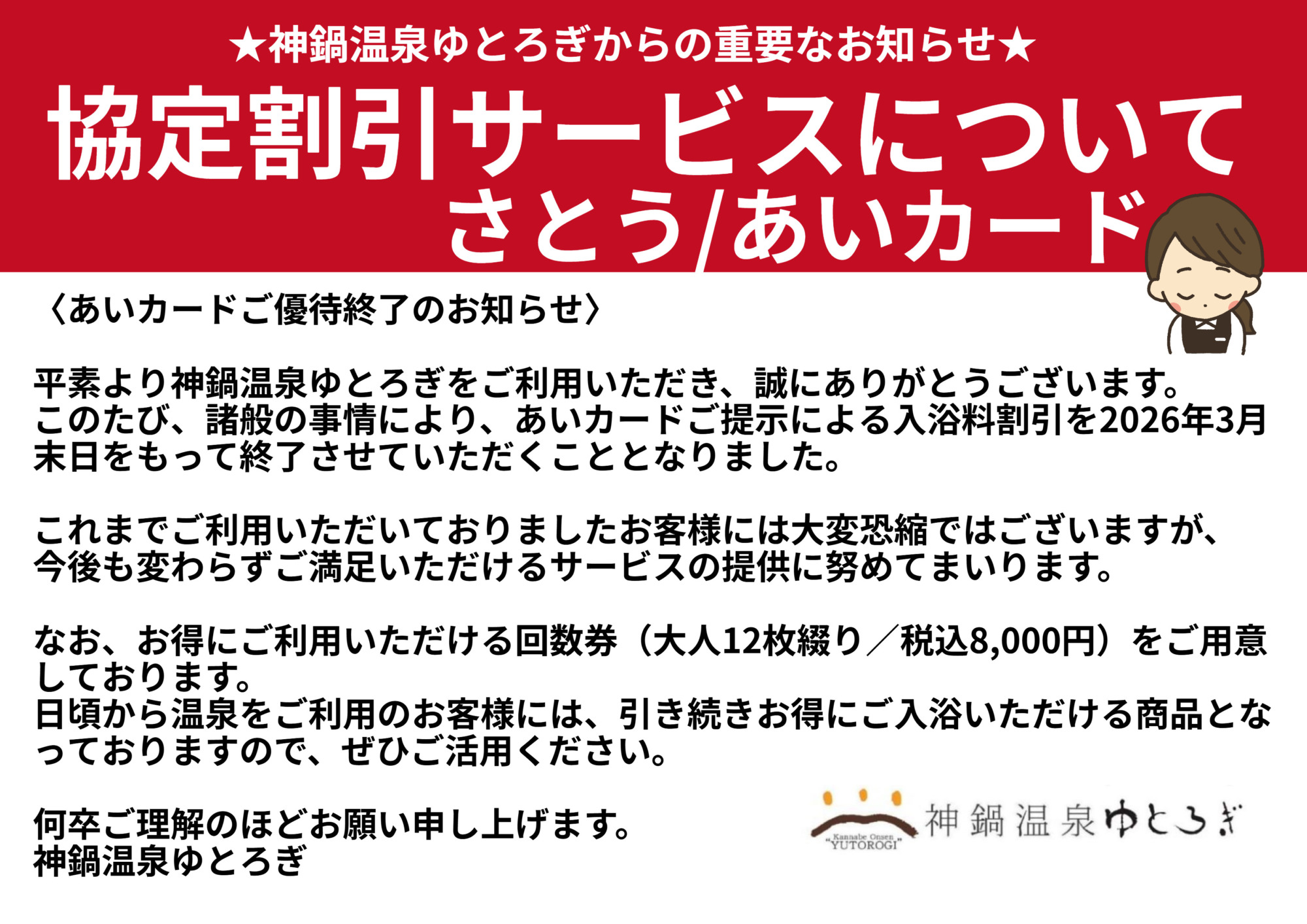 温泉情報Spa 2025.11.30 ★協定割引提携終了のお知らせ(さとう/あいカード)★ 諸般の事情により、あいカードでの提示割引は終了とさせていただきます。 ※2026年3月末日まではご利用いただけます その他の提携割引につきましては継続を予定しておりますが、内容を精査し縮小の予定です。 各種提携割引より回数券がお得となっておりますので、ぜひともご活用ください。 BACK RELATED SITES 関連サイト SNS 神鍋高原の季節の情報をお届けします 「Let's nail this landing!」 「この着氷をバッチリ決めよう!」 神鍋高原か 近畿でここだけ。 噴火口が生んだローカルブランド「KANNABE ROOTS」 兵庫県豊岡市、神鍋 【2/14(土)当日限定!バレンタイン特別企画🍫🍦】 神鍋高原で愛される「ヒラヤミルク」ソフトが、 【2/15限定】冬の神鍋、一番甘い1日。 神鍋高原の冷たい北風と秋の日差しが作り上げた、天然の宝石 神鍋温泉ゆとろぎより、年に一度の特別回数券販売のお知らせです♨️ 日頃よりご利用いただいているお客 \ 2月は毎日オープン!昼も夜も「道の駅」へ ❄️ / 神鍋高原で冬を満喫中の皆さまに、 お食事処か 【2月限定】神鍋の夜⛄️🍲 新鮮野菜のサラダバー付きディナー、オープンします! 「スキーのあと、 神鍋高原は一面の雪景色。 寒さで冷えた体に、温かいご飯が恋しくなる季節です⛄️ そんな今の時期にぴ KANNABE ROOTS #神鍋高原 #道の駅神鍋高原 #神鍋山 春が来たら噴火口で「絶景ピクニック」しませんか?🥪🌋 <木箱に詰まった宝物>画像のお弁当は、神鍋山