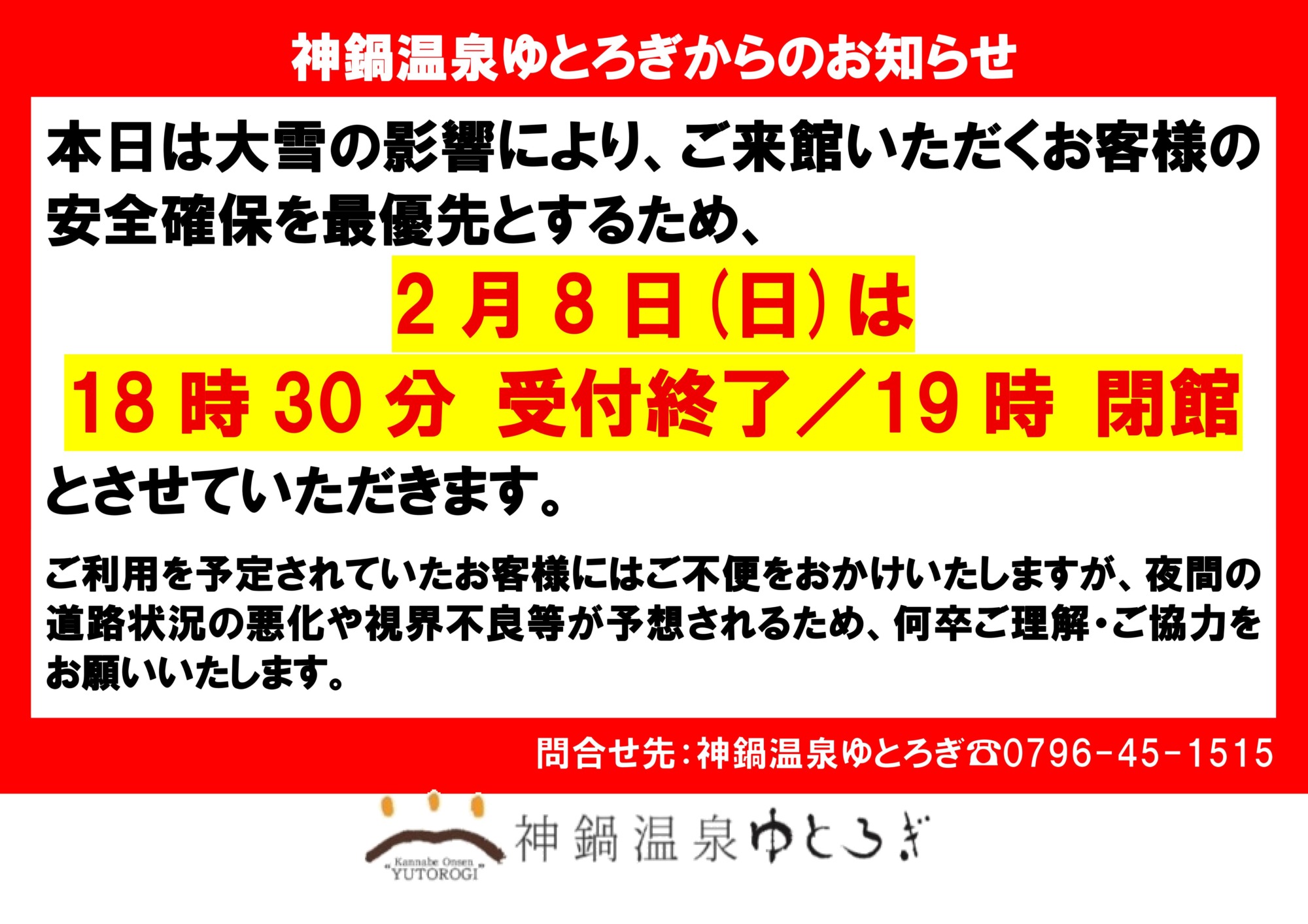 温泉情報Spa 2026.02.08 神鍋温泉ゆとろぎ/2026年2月8日(日)時間短縮のお知らせ 2026年2月8日(日)は大雪のため時短短縮させていただきます。 ご理解ご了承くださいますようお願いいたします。 通常の営業時間は<温泉情報>でご確認ください。 BACK RELATED SITES 関連サイト SNS 神鍋高原の季節の情報をお届けします 工事中でも、お食事処かんなべは元気に営業中🍜 「どこから入るの?」そんな疑問は動画でまるっと解決! 神鍋高原に、春がやってきます 🌿 雪解けとともに芽吹く高原の恵みを 好きなものを好きなだけ、食べ放題 🏪 本日より、仮設店舗で営業スタート! 2/27(金)から、売店・直売所が仮設店舗にて営業を開始し 🍞 道の駅神鍋高原のパン屋さん 「Pain de “A”(パンドアー)」、知ってますか? 「神鍋の 🔨 道の駅神鍋高原、リニューアル工事のお知らせ! ご不便をおかけしますが、工事中も道の駅は元気に営 焚き火の夜に、自然の酒を。🔥 日本初のリジェネラティブ・オーガニック認証を取得したパタゴニア プロビ 「Let's nail this landing!」 「この着氷をバッチリ決めよう!」 神鍋高原か 近畿でここだけ。 噴火口が生んだローカルブランド「KANNABE ROOTS」 兵庫県豊岡市、神鍋 【2/14(土)当日限定!バレンタイン特別企画🍫🍦】 神鍋高原で愛される「ヒラヤミルク」ソフトが、 【2/15限定】冬の神鍋、一番甘い1日。 神鍋高原の冷たい北風と秋の日差しが作り上げた、天然の宝石